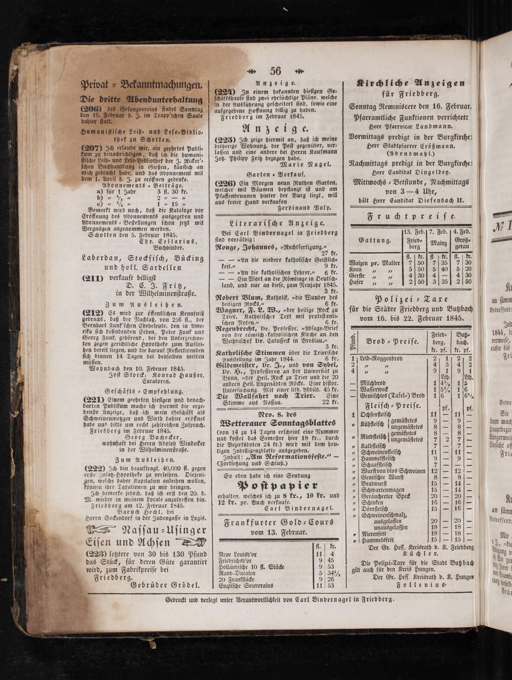 fur die Städte Friedberg und Butzbach vom 16. bis 22. Februar 1845.