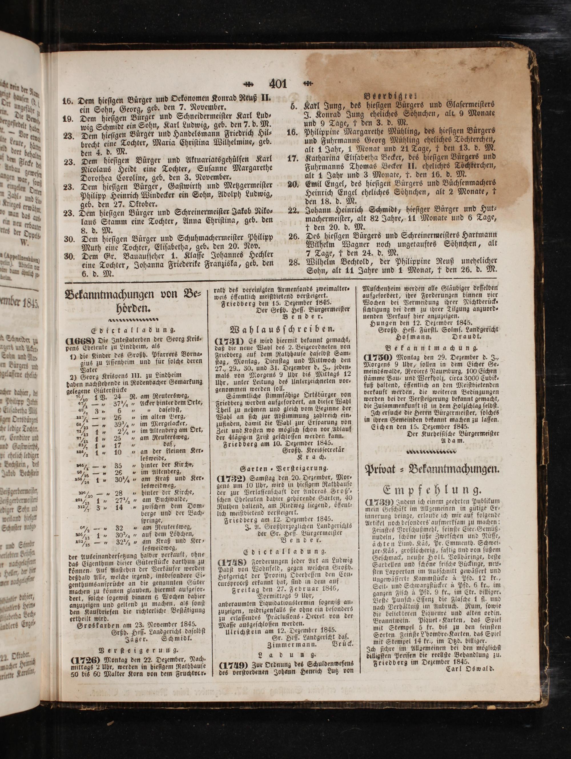 Dem hieſigen Bürger und Schuhmachermeiſter Philipp Muth eine Tochter, Eliſabetha, geb. den 20. Nov. Dem Gr. Bauaufſeher 1. Klaſſe Johannes Hechler eine Tochter, Johanna Friederike Franziska, geb. den