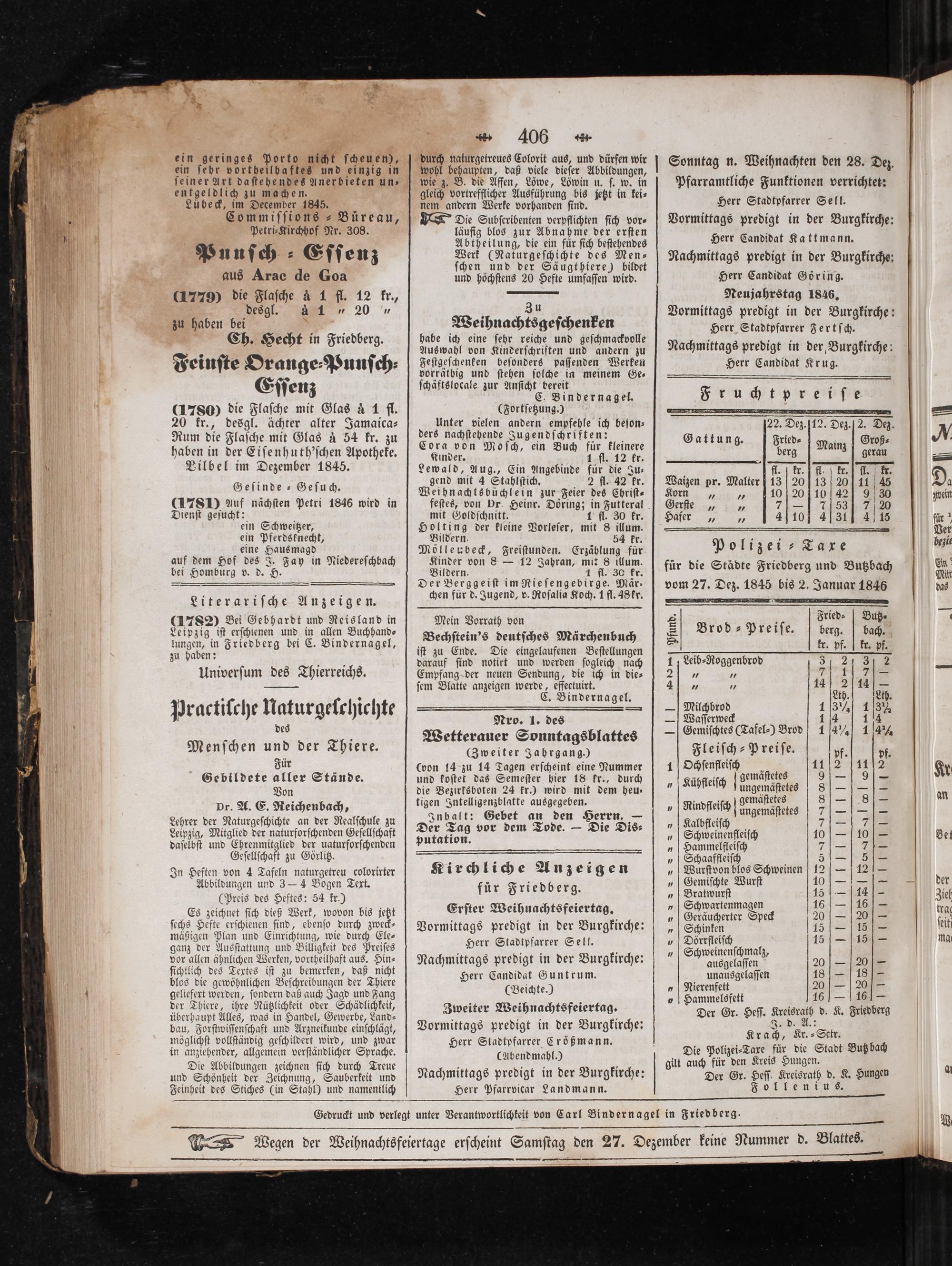 Polizei ⸗ Taxe für die Städte Friedberg und Butzbach vom 27. Dez. 1845 bis 2. Januar 1846