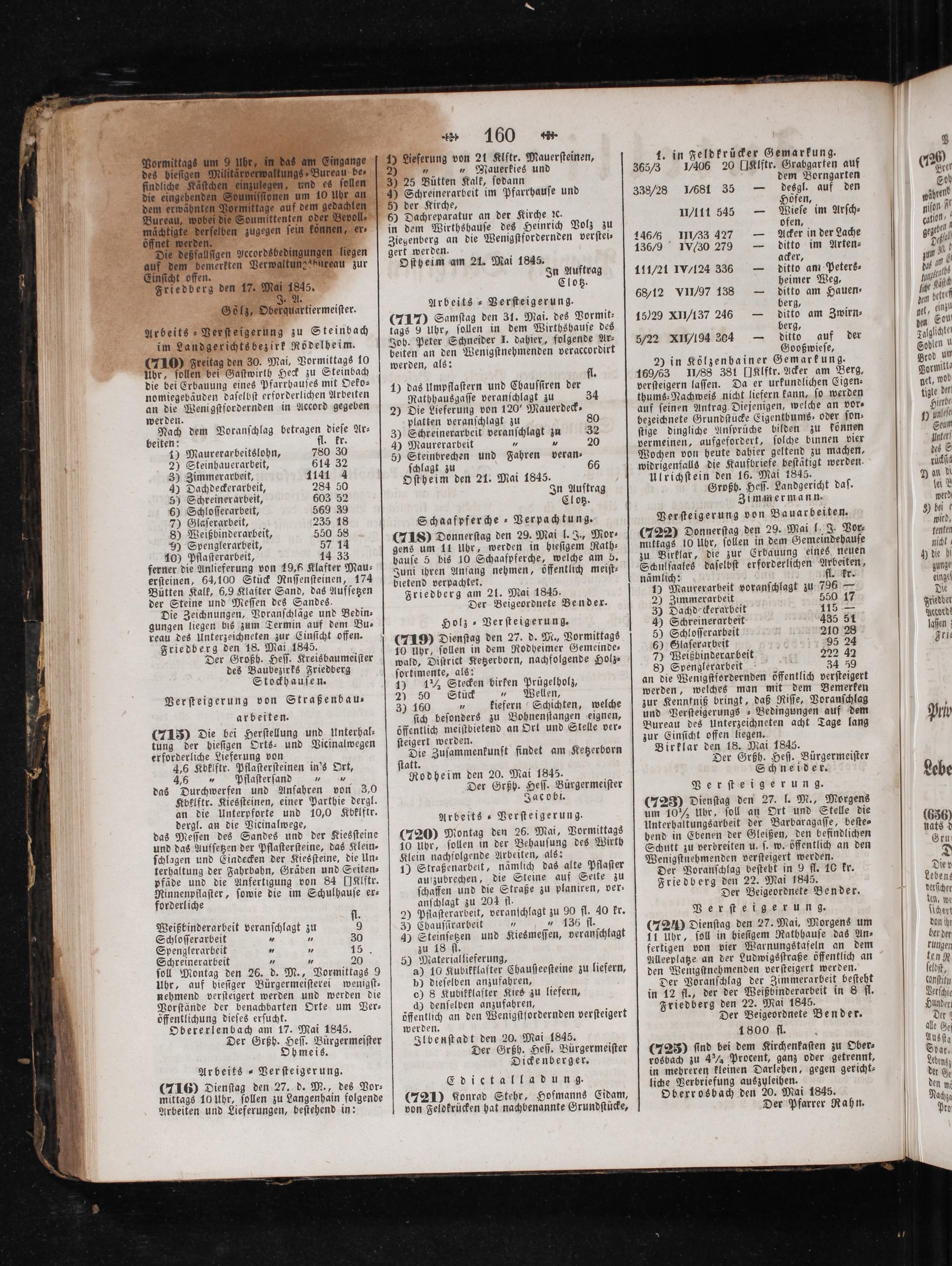 Arbeits Verſteſgerung zu Steinbach im Landgerichtsbezirk Rödelheim. (1100 Freitag den 30. Mai, Vormittags 10 Uhr, ſollen bei Gaſtwirth Heck zu Steinbach die bei Erbauung eines Pfarrhauſes mit Oeko— nomiegebäuden daſelbſt erforderlichen Arbeiten an die Wenigſtfordernden in Accord gegeben