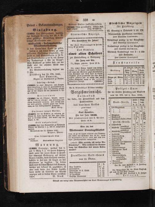 Polizei-Taxe für die Städte Friedberg und Butzbach vom 26. Okt. bis 1. Nov. 1845.