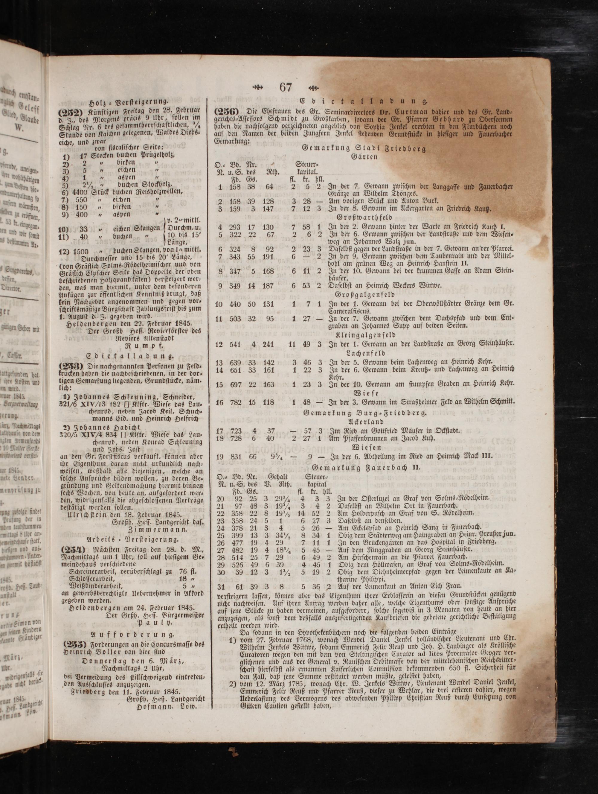 Gärten Steuer⸗ Rth. kapital. f bh. f 64 27 0 2% m. der 7 Gewann zwiſchen der Langgaſſe und Fauerbacher Gränze an Wilhelm Thönges. 128 3 28— Am vorigen Stück und Anton Burk. 147 7 12 3 In der 8. Gewann im Ackergarten an Friedrich Kaußz. Großwarthfeld 130 7 58 1 In der 2. Gewann hinter der Warte an Friedrich Kautz I. 67 2 6 2 In der 6. Gewann zwiſchen der Landſtraße und dem Wieſen⸗ weg an Johannes Walz jun. 5 92 9 Daſelbſt gegen der Landſtraße in der 7. Gewann an der Pfarrei. 191 6— 2 In der 9. Gewann zwiſchen dem Taubenrain und der Mittel⸗ hohl am grünen Weg an Heinrich Hanſtein II. i 168 6 11 2 In der 10. Gewann bei der krummen Gaſſe an Adam Stein⸗ häuſer. 187 6 53 2 Daſelbſt an Heinrich Weckers Wittwe. Großgalgenfeld 131 1 7 1 In der 1. Gewann bei der Oberwöllſtädter Gränze dem Gr. Cameralfiscus 95 1 27— In der 7. Gewann zwiſchen dem Dachspfad und dem Ent⸗ graben an Johannes Supp auf beiden Seiten. Kleingalgenfeld 241 11 49 3 In der 1. Gewann an der Landſtraße an Georg Steinhäuſer. Lachenfeld 142 3 46 3 In der 5. Gewann beim Lachenweg an Heinrich Kehr. 161 1 22 3 In der 6. Gewann beim Kreutz- und Lachenweg an Heinrich Kehr. 163 1 23 3 In der 10. Gewann am ſtumpfen Graben an Heinrich Kehr. Wieſe 118 1 48— In der 3. Gewann im Straßhelmer Feld an Wilhelm Schmitt. Gemarkung Burg⸗Friedberg. Ackerland 37— 57 3 Im Ried an Gottfried Mäuſer in Ockſtadt. 40 2 27 1 Am Pfaffenbrunnen an Jacob Kuh. Wieſen 9— 9— In der 6. Abtheilung im Ried an Heinrich Mack III. Gemarkung Fauerbach II. Gehalt Steuer⸗ V. Rth. kapital fl. kr. pll. 5 6 3 29% 4 3 3 In der Oſterluzei an Graf von Solms-Rödelheim 3 19% 3 4 2 Daſelbſt an Wilhelm Ort in Fauerbach. 8 19% 14 52 2 Am Holderpuſch an Graf von S. Rödelheim. 5 Filit 6 27 3 Daſelbſt an denſelben. 0 3 4 5 26— Am Eckelspfad an Heinrich Sang in Fauerbach. l 31 347 8 34 1 Obig dem Städterweg am Haingraben an Heinr. Preußer jun. 4 29 7 11 1 In den Brückengärten an das Hospital in Friedberg. 4 18¾ 5 45— Auf dem Ringgraben an Georg Steinhäuſer. 7 20 6 49. 2 Am Hirſchenrain an die Pfarrei Fauerbach. a 6 39 4 45 1 Obig dem Höllwaſen, an Graf von Solms-⸗Rödelheim. 1 3 1%½% 5 19 2 Obig dem Diehnheimerpfad gegen der Leimenkaute an Ka⸗ tharine Philippi. 2 8 5 36 2 Auf der Leimenkaut an Anton Eich Frau.
