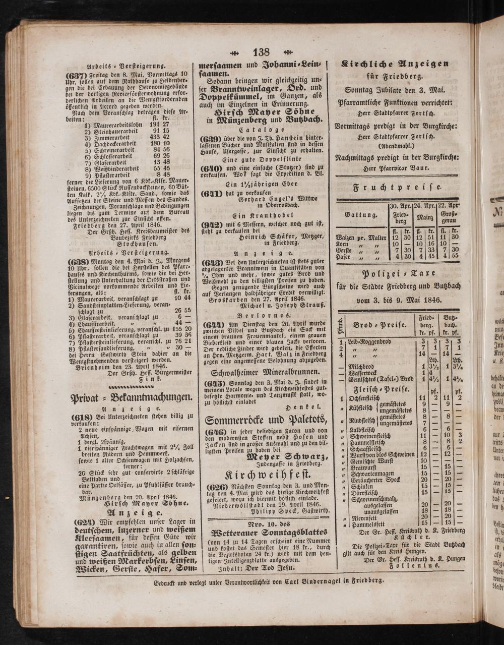 Gedruckt und verlegt unter Verantwortlichkeit von Carl Bindernagel in Friedberg.