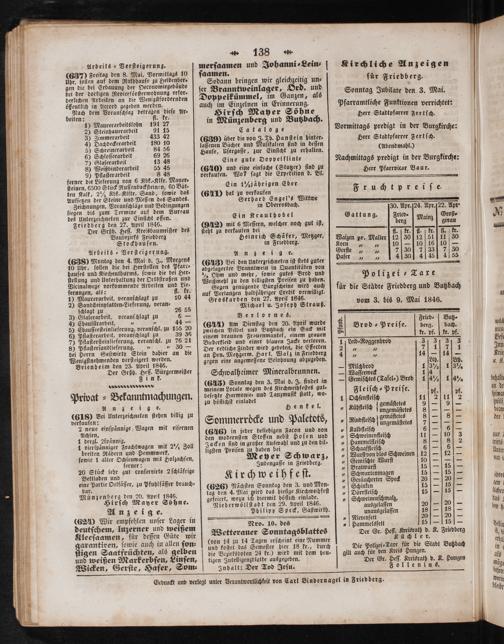 Polizei ⸗ Taxe für die Städte Friedberg und Butzbach vom 3. bis 9. Mai 1846.