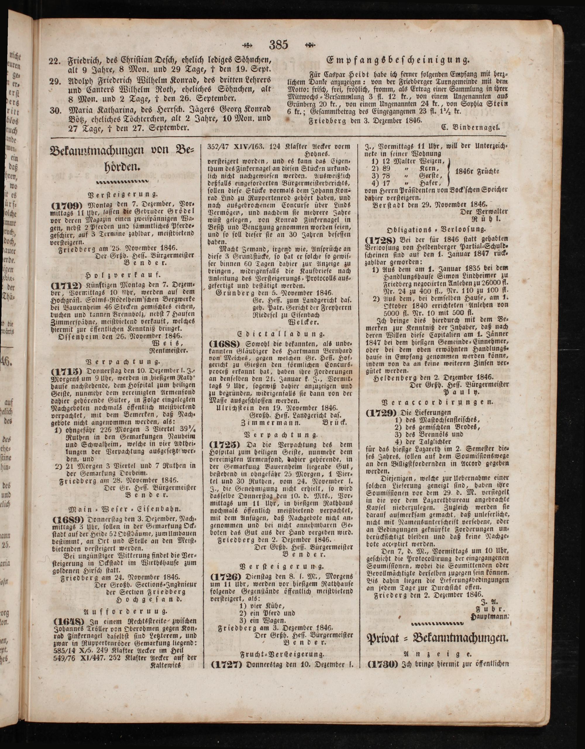 Friedberg am 3. Dezember 1846. Der Grßh. Heſſ. Bürgermeiſter 5 Bender.