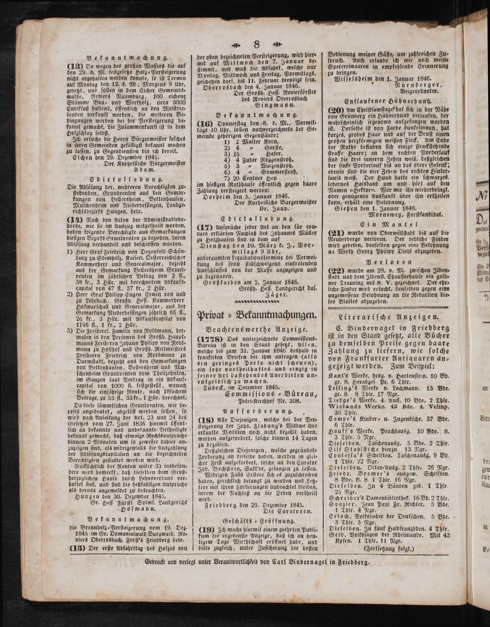 Gedruckt und verlegt unter Verantwortlichkeit von Carl Bindernagel in Friedberg.