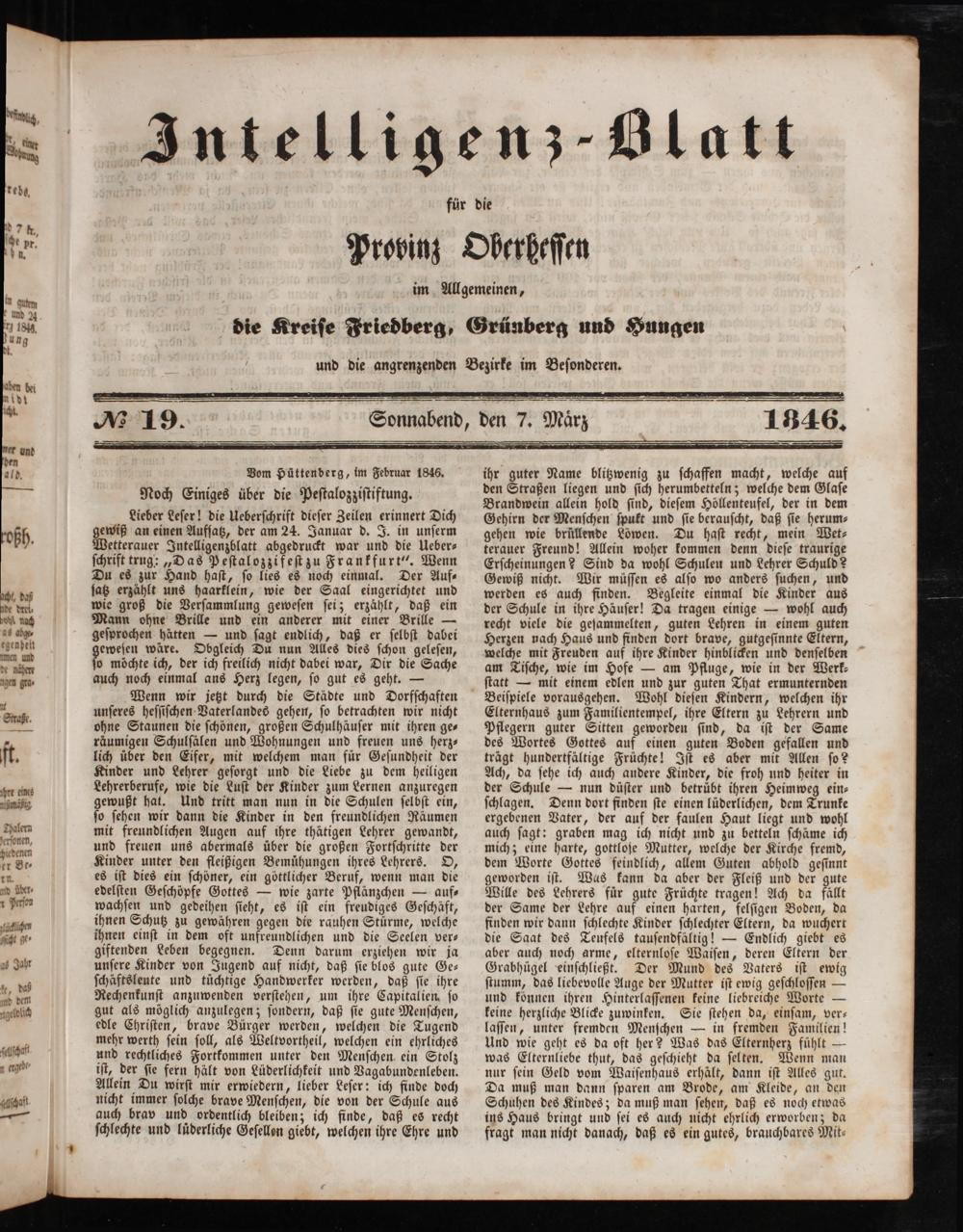 Vom Hüttenberg, im Februar 1846. Noch Einiges über die Peſtalozziſtiftung.