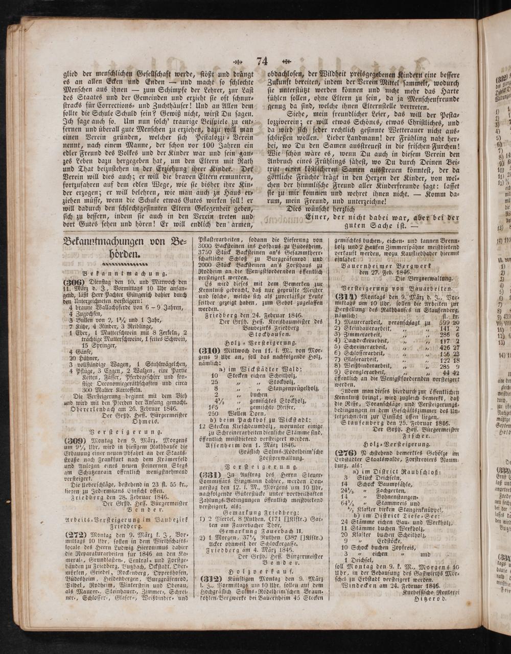 verſteigert werden. a Es wird dieſes mit dem Bemerken zur Kenntnib gebracht, daß nur geprüfte Meiſter und ſolche, welche ſich als zuverläſſige Leute ſeither gezeigt haben, zum Gebot zugelaſſen werden. Friedberg den 24. Februar 1846, Der Grßh. Heſſ. Kreisbaumeiſter des Baubezirks Friedberg Stockhauſen. Holz ⸗Verſteigerung. (310) Mittwoch den 11. l. M., von Mor⸗ gens 9 Uhr an, ſoll das nachfolgende Holz, nämlich: e a) im Wickſtädter Wald: 10 Stecken eichen Scheitholz,