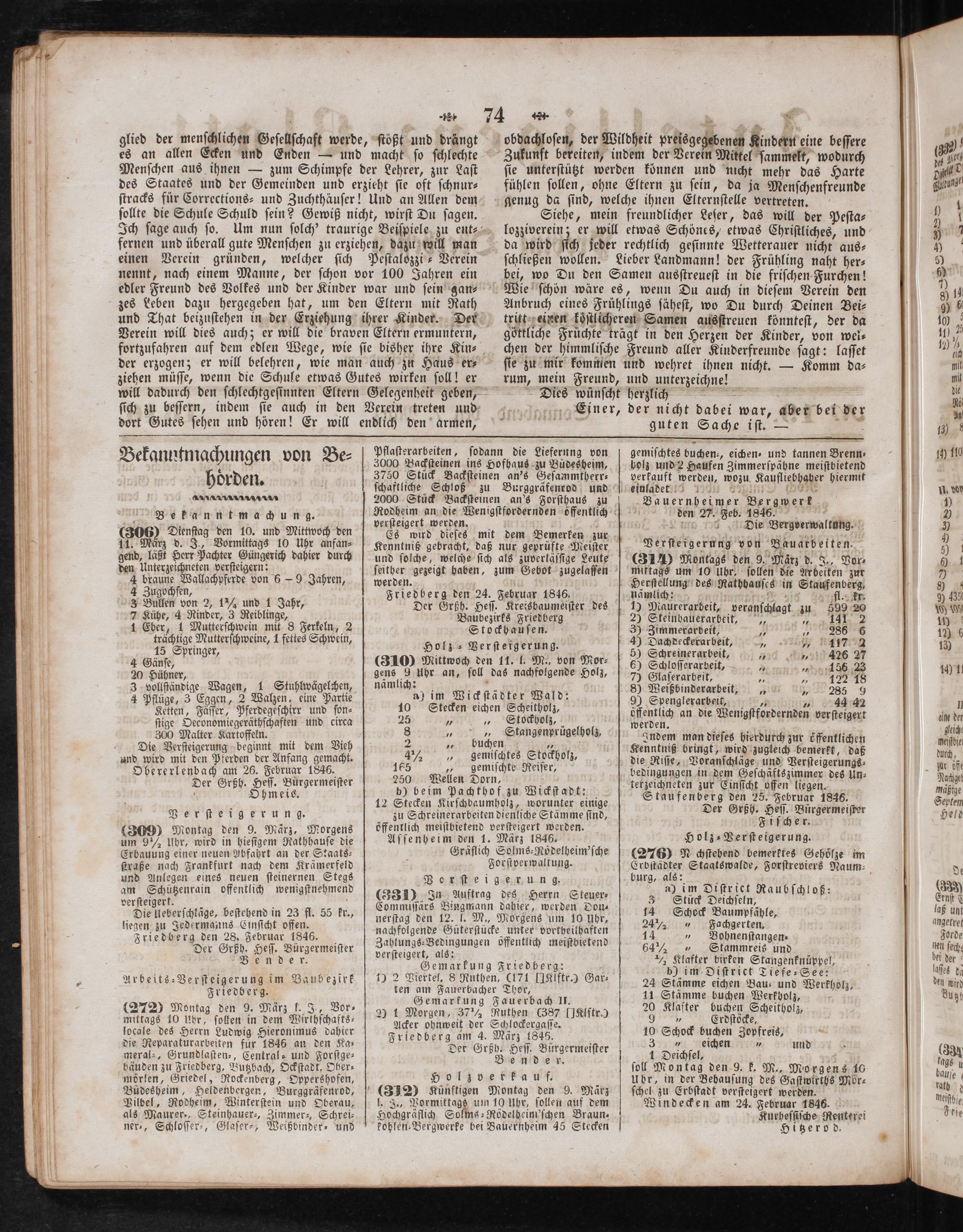 Arbeits⸗Verſteigerung im Baubezirk Friedberg. (272) Montag den 9. März l. J., Vor⸗ mittags 10 Uhr, ſollen in dem Wirkhſchafts— locale des Herrn Ludwig Hieronimus dahier die Reparaturarbeiten fuͤr 1846 ͤ an den Ka⸗ meral⸗, Grundlaſten⸗, Central- und Forſtge⸗ bäuden zu Friedberg, Butzbach, Ockſtadt, Oher⸗ mörlen, Griedel, Rockenberg, Oppershofen, Büdesheim, Heldenbergen, Burggräfenrod, Vilbel, Rodheim, Winterſtein und Oberau, als Maurer., Steinhauer⸗, Zimmer-, Schrei⸗ ner⸗, Schloſſer⸗, Glaſer⸗, Weißbinder⸗ und