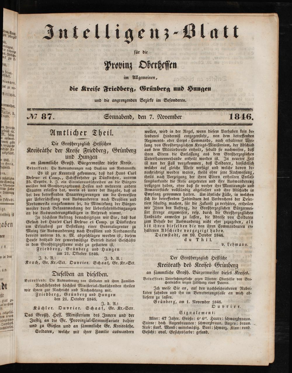 Betreffend: Die Auswanderung von Soldaten mit ihren Familien. Nachſtehendes höchſtes Miniſterial-Ausſchreiben theilen wir ihnen zur Nachricht und Nachachtung mit. Friedberg, Grünberg und Hungen den 21. October 1846.