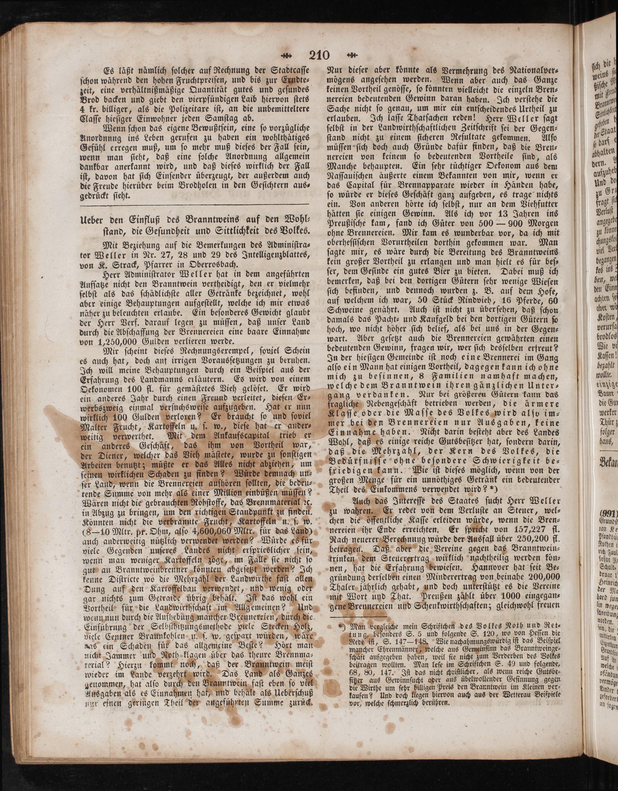 Herr Adminiſtrator Weller hat in dem angeführten Aufſatze nicht den Branntwein vertheidigt, den er vielmehr ſelbſt als das ſchädlichſte aller Getränke bezeichnet, wohl aber einige Behauptungen aufgeſtellt, welche ich mir etwas näher zu beleuchten erlaube. Ein beſonderes Gewicht glaubt der Herr Verf. darauf legen zu müſſen, daß unſer Land durch die Abſchaffung der Brennereien eine baare Einnahme von 1,250,000 Gulden verlieren werde.