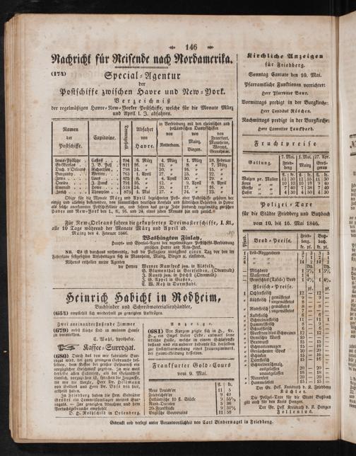 Polizei ⸗ Taxe für die Städte Friedberg und Butzbach vom 10. bis 16. Mai 1846.