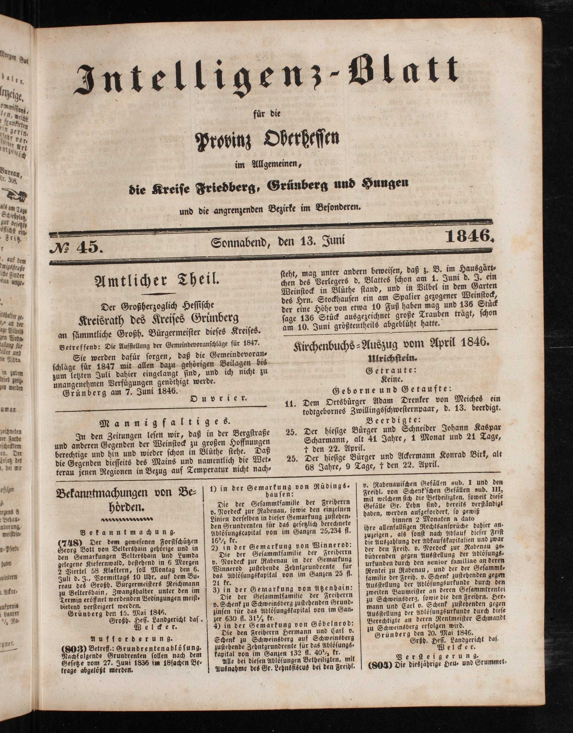 halber ge, 7 7 E +* Kreisrath des Kreiſes Gruͤnberg ſage 136 Stück ausgezeichnet große Trauben trägt, ſchon 5 an ſümmtliche Großh. Bürgermeiſter dieſes Kreiſes. am 10. Juni groößtentheils abgeblüht hatte. ung für age fü n ib Betreffend: Die Aufſtellung der Gemeindevoranſchläge für 1847. 7 1 7 ie Nidda g Sie werden dafur ſorgen, daß die Gemeindevoran⸗ Kirchenbuchs⸗Auszug vom April 1846. u dme ſchläge für 1847 mit allen dazu gehörigen Beilagen bis Ulrichſtein. met getz, zum letzten Juli dahier eingelangt ſind, und ich nicht zu Getraute: en werten unangenehmen Verfügungen genöthigt werde. Keine Grünberg am 7. Juni 1846 Sir Geborne und Getaufte: ums 11. Dem Ortsbürger Adam Drenker von Meiches ein a 5 todtgebornes Zwillingsſchweſternpaar, d. 13. beerdigt. .. Beerdigte: ier Farbe In den Zeitungen leſen wir, daß in der Bergſtraße 25. Der hieſige Bürger und Schneider Johann Kaspar 02 5 9 9 9 p *— und anderen Gegenden der Weinſtock zu großen Hoffnungen Scharmann, alt 41 Jahre, 1 Monat und 21 Tage, irh— berechtige und hin und wieder ſchon in Blüthe ſtehe. Daß T den 22. April. , def nir die Gegenden dieſſeits des Mains und namentlich die Wet⸗ 25. Der hieſige Bürger und Ackermann Konrad Birk, alt terau jenen Regionen in Bezug auf Temperatur nicht nach⸗ 68 Jahre, 9 Tage, f den 22. April. einm g. 3 1 ) in der Gemarkung von Rüdings⸗ v. Rabenauiſchen Gefallen sub. 1 und den 4 5 von Be⸗ hauſen: Freihl. W e ee sub. III, gens 8 or Die der Geſammtfamilie der Freiherrn mit welchem ſich die Be. heiligten, ſoweit dieſe — en. v. Nordeck zur Rabenau, ſowie den einzelnen Gefälle Gr. Lehn ſind, bereits verſtäaͤndigt nderung Linien derſelben in dieſer Hemau zuſteben⸗ haben, ee ee ſo 1 den Grundrenten für das geſetzlich berechnete FFF * Bekanntmachung. Ablöͤfungscapital von im 77075 25,234 fl. ibre allenfallſgen Rechtsanſprücbe dabier ai bim Kat Der dem geweſenen Forſtſchützen 16 ½ kr. zuzeigen, als ſonſt nach Ablauf dieſer Friſt * eorg Bott von Beltershain gehoͤrige und in 2) in der Gemarkung von Winnerod: die Auszahlung der Abkaufskapitalten und zwe „n den Gemarkungen Beltershain und Lumda Die der Geſammtfamilie der Freiherrn der den Freih. v. Nordeck zur Rabenau ge⸗ gelegene Kiefernwald, beſtehend in 6 Morgen v. Nordeck zur Rabenau in der Gemarkung dübrenden gegen Ausstellung der Ablöſungs⸗ alen 2 Viertel 58 Klaftern, ſoll Montag den 6. Winnerod zuſtehende Zehntgrundrente für urkunden durch den senior familiae an deren 1 Juli d. J., Vormittags 10 Uhr, auf dem Bu das Abloͤſungskapital von im Ganzen 25 fl.] Rentei zu Rabenau, und der der Geſammt⸗ ner, reau des Großh. Bürgermeiſters Reichmann 21 kr. familie der Freih. v. Schenk zuſtehenden gegen . zu Beltersbain, Zwangshalber unter den im 3) in der Gemarkung don Atzenbain:] Ausſtellung der Ablöͤfungsurkunde durch den 9250 Termin eröffnet werdenden Bedingungen meiſt⸗ Die der Geſammtfamilie der Freiherrn] zweiten Baumeiſter an deren Geſammtrentei 1 bietend verſteigert werden. v. Schenk zu Schweinsberg zuſtehenden Grund. zu, Schweinsberg, ſowie die den Freibrn. Her⸗ „ Grünberg den 15. Mai 1846. zinſen für das Abloͤſungskapital von im Gan. mage und Carl v. Schenk zuſtebenden gegen N. Großh. Heſſ. Landgericht das. zer 630 fl. 31½ kr. Ausſtellung der Ablöſungsurkunde durch dieſe Welcker. 4) in der Gemarkung von Göbelnrod: en. dee Schmandt 8 Die den Freiherrn Hermann und Carl v. zu Schwe erg erſeigggeeen. ner Aufforderung. Schenk zu Schweinsberg auf Schweinsberg Grünberg den 20. Mai 1846. —(803) Betreff: Grundrentenablö ung. zuſtebende Zebntgrundrenke für das Ablolungs⸗ Grßb. Heſſ. Landgericht da. Nachfolgende Grundrenten ſollen nach dem kapital von im Ganzen 132 fl. 40 ¼ kr. Welcker. Geſetze vom 27. Juni 1836 im 18fachen Be⸗ Alle bei dieſen Abloͤſungen Betbeilisten, mit Verſteige rung. Ausnahme des Gr. Lehnsfiscus bei den Freihl.(So) Die diesjährige Heu- und Grummet⸗