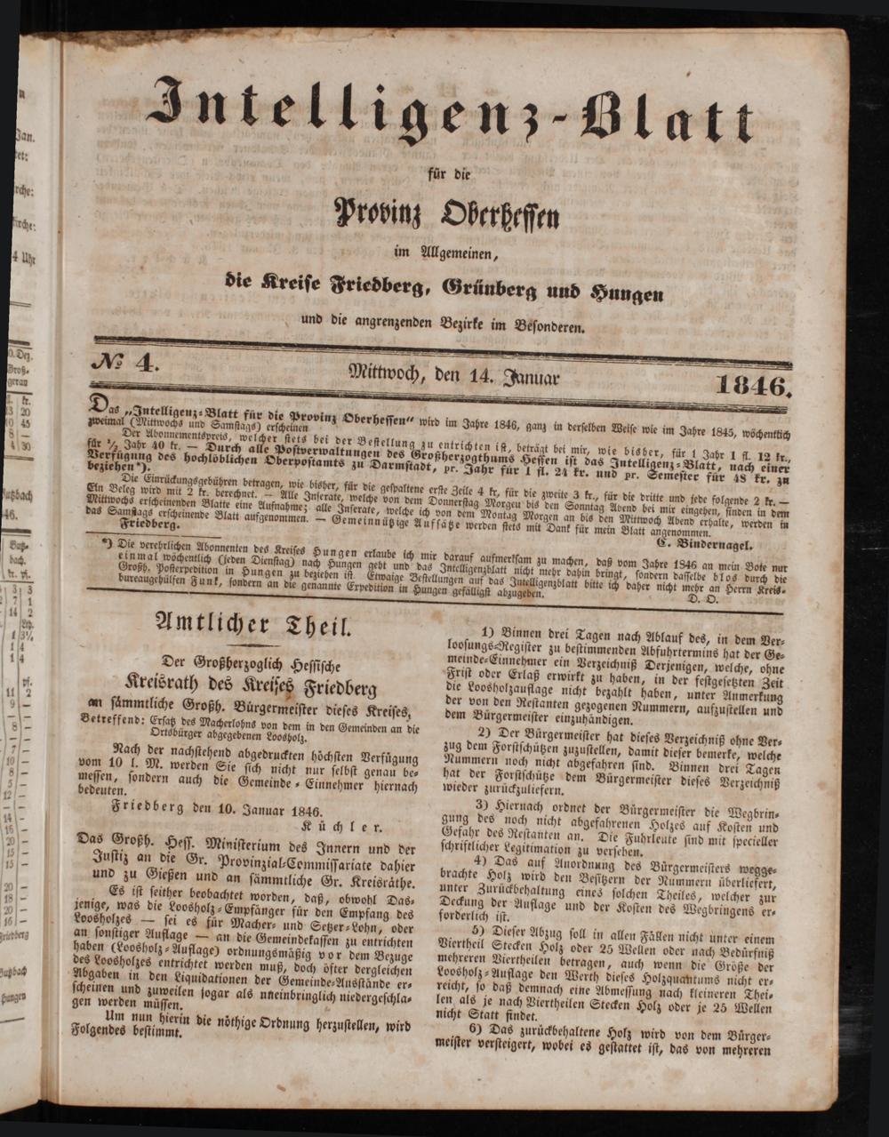 8„Intelligenz⸗Blatt für die Provinz Oberheſſen“ wird im Jahre 1846, ganz in derſelben Weiſe wie im Jahre 1845, wöchentlich zweimal(Mittwochs und Samſtags) erſcheinen ö Der Abonnementspreis, 1 ſtets bei der Beſtellung zu entrichten iſt, beträgt bei mir, wie bisher, für 1 Jahr 1 fl. 12 kr., für ½ Jahr 40 kr.— Durch alle Poſtverwaltungen des Groſherzogthums Heſſen iſt das Intelli enz⸗Blatt, nach einer beziehen des hochlöblichen Oberpoſtamts zu Darmſtadt, pr. Jahr für 1 fl. 24 kr. und pr. Semeſter für 48 kr. zu ziehen“).