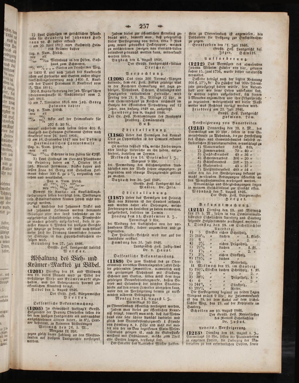 (1201) Dienſtag den 18. und Mittwoch den 19. dieſes Monats wird zu Vilbel der dießjährige Vieh⸗ und Krämermarkt abge⸗ halten, was der Unterzeichnete hiermit zur öffentlichen Kenntmiß bringt. Vilbel den 5. Auguſt 1846. Der Grßh. Heſſ. Bürgermeiſter Breiter.