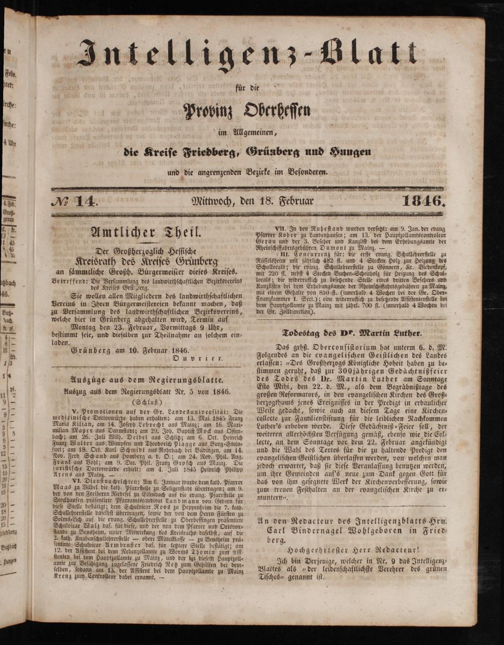 An den Redacteur des Intelligenzblatts Hrn. Carl Bindernagel Wohlgeboren in Fried— berg.
