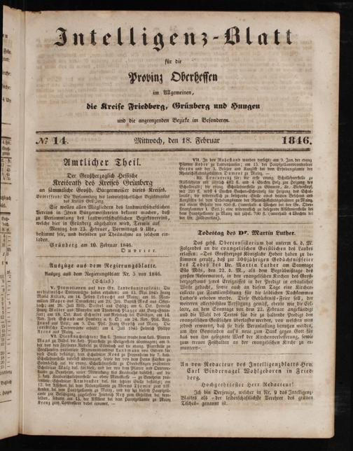 Das grhß. Oberconſiſtorium hat unterm 6. d. M. Folgendes an die evangeliſchen Geiſtlichen des Landes erlaſſen:„Des Großherzogs Königliche Hoheit haben zu be— ſtimmen geruht, daß zur 300 jährigen Gedächtnißfeier des Todes des Dr. Martin Luther am Sonntage Eſto Mihi, den 22. d. M., als dem Begräbnißtage des großen Reformators, in den evangeliſchen Kirchen des Groß— herzogthums jenes Ereiguiſſes in der Predigt in erbaulicher Weiſe gedacht, ſowie auch an dieſem Tage eine Kirchen— collecte zur Familienſtiftung für die leiblichen Nachkommen Luther's erhoben werde. Dieſe Gedächtniß-Feier ſoll, der weiteren allerhöchſten Verfügung gemäß, ebenſo wie die Col⸗ lecte, an dem Sonntage vor dem 22. Februar angekündigt und die Wahl des Textes fuͤr die zu haltende Predigt den evangeliſchen Geiſtlichen überlaſſen werden, von welchen man jedoch erwartet, daß ſie dieſe Veranlaſſung benutzen werden, um ihre Gemeinden auf's neue zum Dank gegen Gott fuͤr das von ihm geſegnete Werk der Kirchenverbeſſerung, ſowie zum treuen Feſthalten an der evangeliſchen Kirche zu er— muntern /.