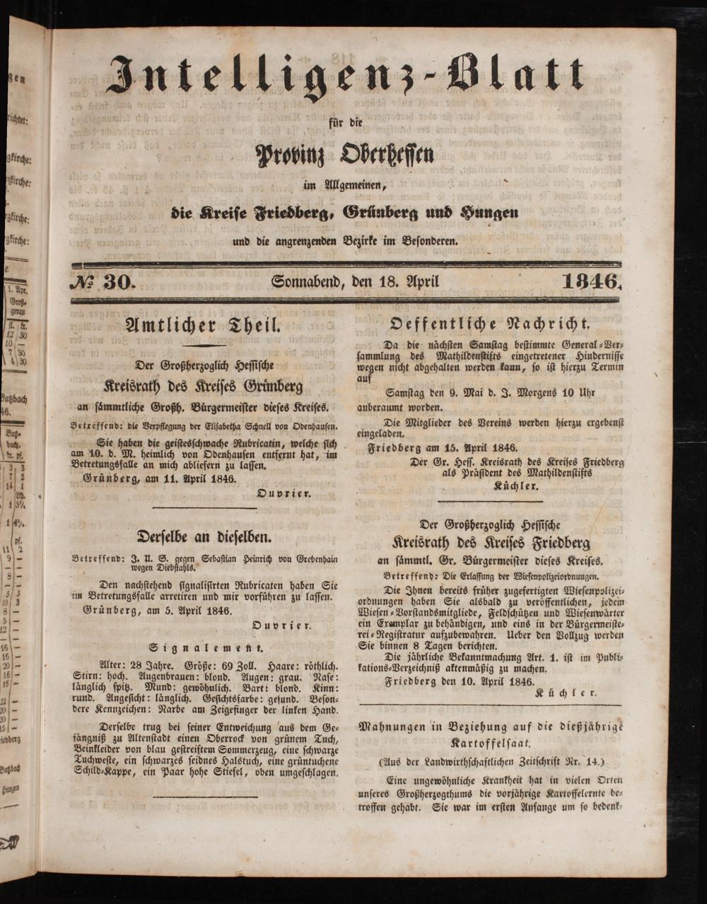 Sie haben die geiſtesſchwache Rubricatin, welche ſich am 10. d. M. heimlich von Odenhauſen entfernt hat, im Betretungsfalle an mich abliefern zu laſſen. Grünberg, am 11. April 1846. Ouvrier.