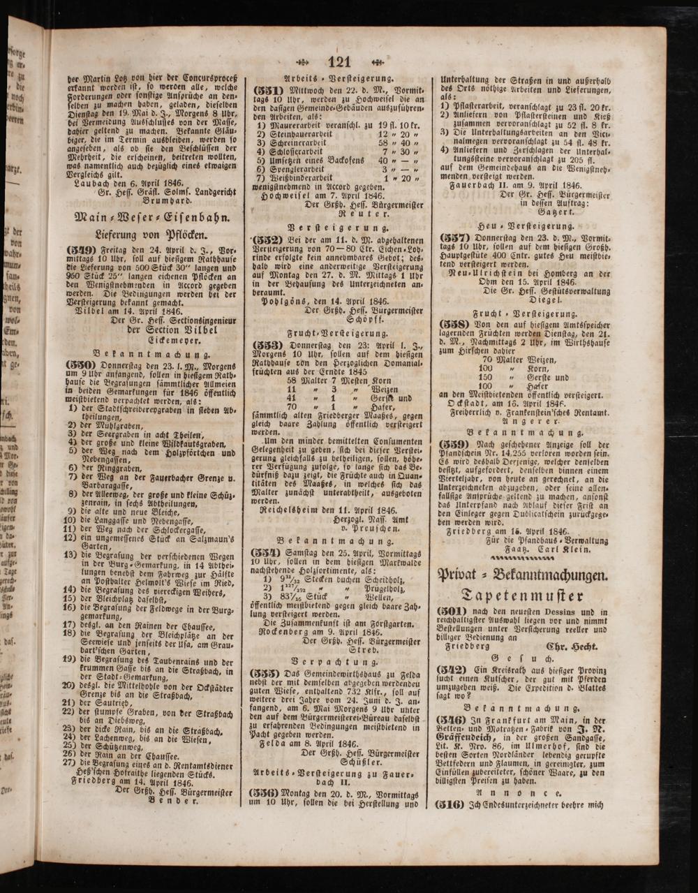 (549) Freitag den 24. April d. J., Vor⸗ mittags 10 Uhr, ſoll auf hieſigem Rathhauſe die Lieferung von 500 Stück 30“ langen und 950 Stück 25“ langen eichenen Pflocken an den Wenigſtnebmenden in Accord gegeben werden. Die Bedingungen werden bei der Verſteigerung bekannt gemacht. Vilbel am 14. April 1846. Der Gr. Heſſ. Sectionsingenieur der Section Vilbel