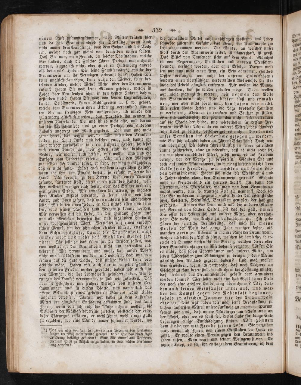 ter, welche noch gar nichts von demſelben wiſſen ſollten. Daß Sie nun, mein Freund, bei ſolcher Theilnahme, welche Sie finden, auch die Früchte Ihrer Predigt wahrnehmen werden, leugne ich nicht, oder iſt es im Hüttenberg anders als bei uns? Haben Sie keine Familienväter, welche der Branntwein um ihr Vermögen gebracht hat? Haben Sie keine unglücklichen Ehen, keine ſeufzenden Weiber, keine bet⸗ telnden Kinder, welche Wehe! Wehe! über den Branntwein rufen? Haben Sie noch keine Männer geſehen, welche in Folge ihrer Trunkenheit ſchon in den beßten Jahren dahin⸗