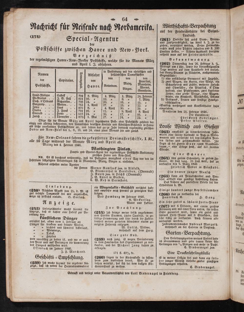 Mainz den 4. Februar 1846, 5 Washington Finlay, Haupt⸗ und Special⸗Agent der regelmäßigen Poſtſchiffs⸗Verbindung . zwiſchen Havre und New⸗York. NB. Es iſt durchaus nothwendig, daß die Paſſagiere wenigſtens einen Tag vor den im Fahrplane feſtgeſetzten Abfahrttagen ſich in Mannheim, Mainz, Bingen ꝛc. einfinden. Näheres ertheilen meine Agenten