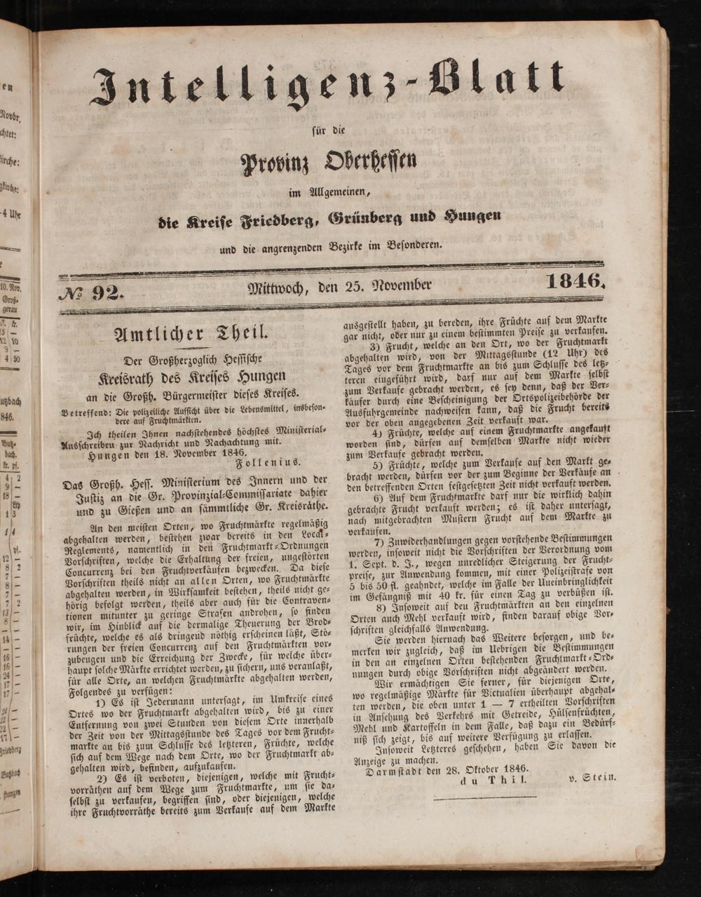 Betreffend: Die polizeiliche Aufficht über die Lebensmittel, insbeſon⸗ dere auf Fruchtmärkten. Ich theilen Ihnen nachſtehendes höchſtes Miniſterial⸗ Ausſchreiben zur Nachricht und Nachachtung mit. Hungen den 18. November 1846. Follenius.