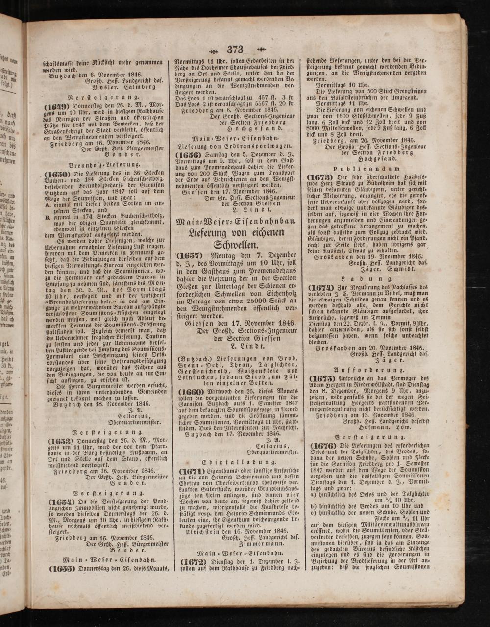 (1637) Montag den 7. Dezember d. I, des Vormittags um 10 Uhr, ſoll in dem Gaſthaus zum Promenadehaus dahier die Lieferung der in der Section Gießen zur Unterlage der Schienen er⸗ forderlichen Schwellen von Eichenholz im Betrage von etwa 25000 Stück an den Weuigſtnehmenden öffentlich ver— ſteigert werden. Gieſſen den 17. November 1846 Der Großh. Sections-Ingenieur der Section Gieſſen L. Lin dt⸗