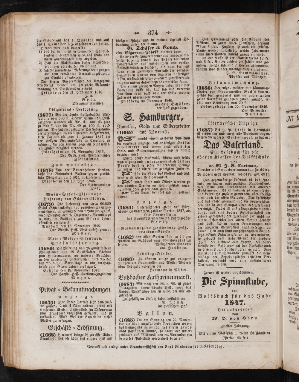 Gedruckt und verlegt unter Verantwortlichkeit von Carl Bindernagel in Friedberg.