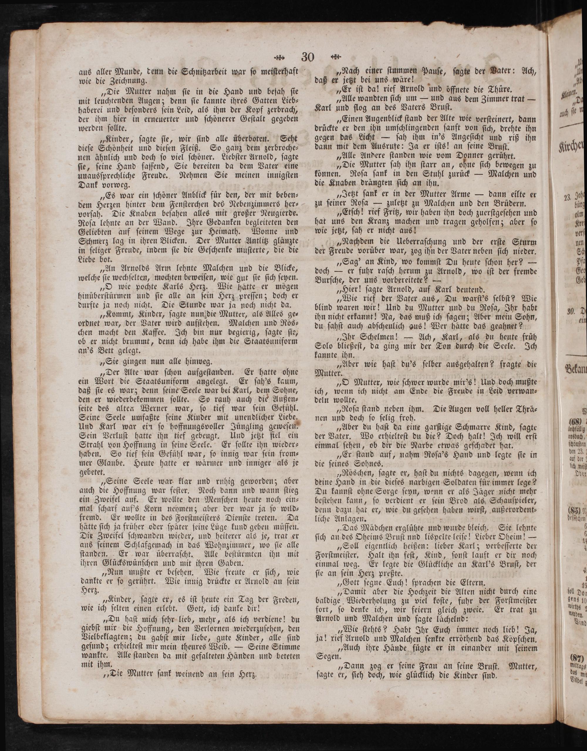„Seine Seele war klar und ruhig geworden; aber auch die Hoffnung war feſter. Noch dann und wann ſtieg ein Zweifel auf. Er wollte den Menſchen heute noch ein— mal ſcharf auf's Korn nehmen; aber der war ja ſo wild— fremd. Er wollte in des Forſtmeiſters Dienſte treten. Da hätte ſich ja früher oder ſpäter ſeine füge kund geben müſſen. Die Zweifel ſchwanden wieder, und heiterer als je, trat er aus ſeinem Schlafgemach in das Wohnzimmer, wo ſie alle ſtanden. Er war überraſcht. Alle beſtürmten ihn mit ihren Glückswünſchen und mit ihren Gaben.