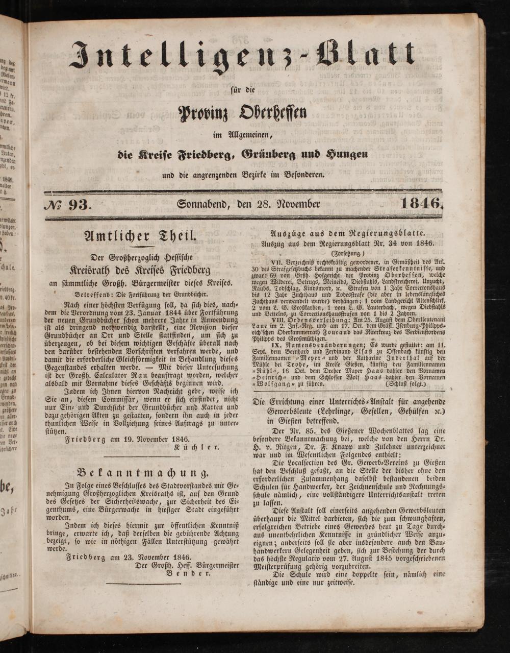 Die Localſection des Gr. Gewerb-Vereins zu Gießen hat den Beſchluß gefaßt, an die Stelle der bisher ohne den erforderlichen Zuſammenhang daſelbſt beſtandenen beiden Schulen für Handwerker, der Zeichnenſchule und Rechnungs- ſchule nämlich, eine vollſtändigere Unterrichtsanſtalt treten zu laſſen.