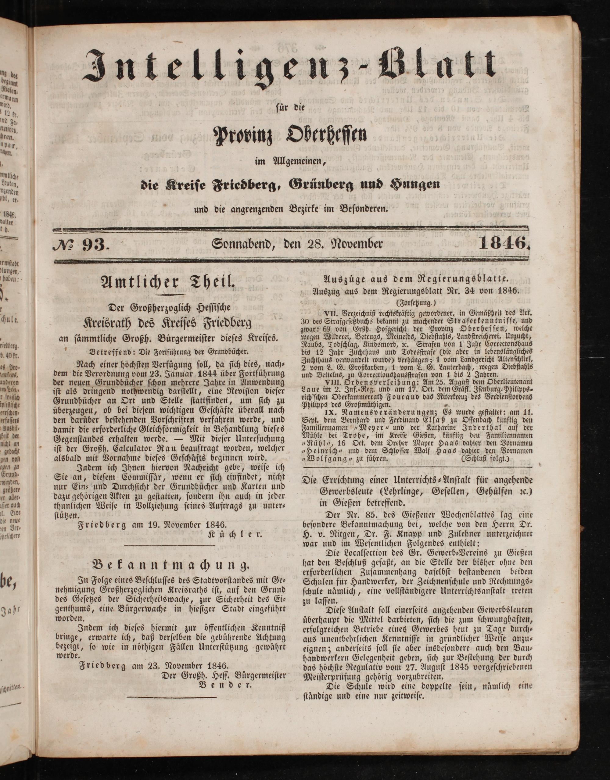 Die Errichtung einer Unterrichts-Anſtalt für angehende Gewerbsleute(Lehrlinge, Geſellen, Gehülfen ꝛc.) in Gießen betreffend.