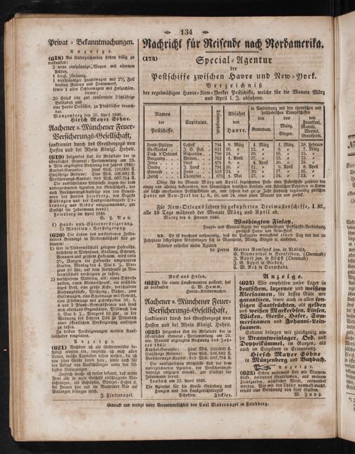 Für New⸗ Orleans fahren die gekupferten Dreimaſterſchiffe, I. Kl, alle 10 Tage während der Monate März und April ab. ö Mainz den 4. Februar 1846. 8. f i Washington Finlay,. Haupt⸗ und Special⸗Agent der regelmäßigen Poſtſchiffs⸗Verbindung zwiſchen Havre und New⸗YNork. NB. Es iſt durchaus nothwendig, daß die Paſſagiere wenigſtens einen Tag vor den im Fahrplane feſtgeſetzten Abfahrttagen ſich in Mannheim, Mainz, Bingen ꝛc. einfinden. 8 5 Näheres ertheilen meine Agenten die Herren Werner Ramſpeck jun. in Alsfeld, 1 S. Blumenthal in Beerfelden,(Odenwald) J. Rauth jun. in Höchſt(Odenwald) J. G. Appel in Gießen,. C. W. Reh in Darmſtadt.