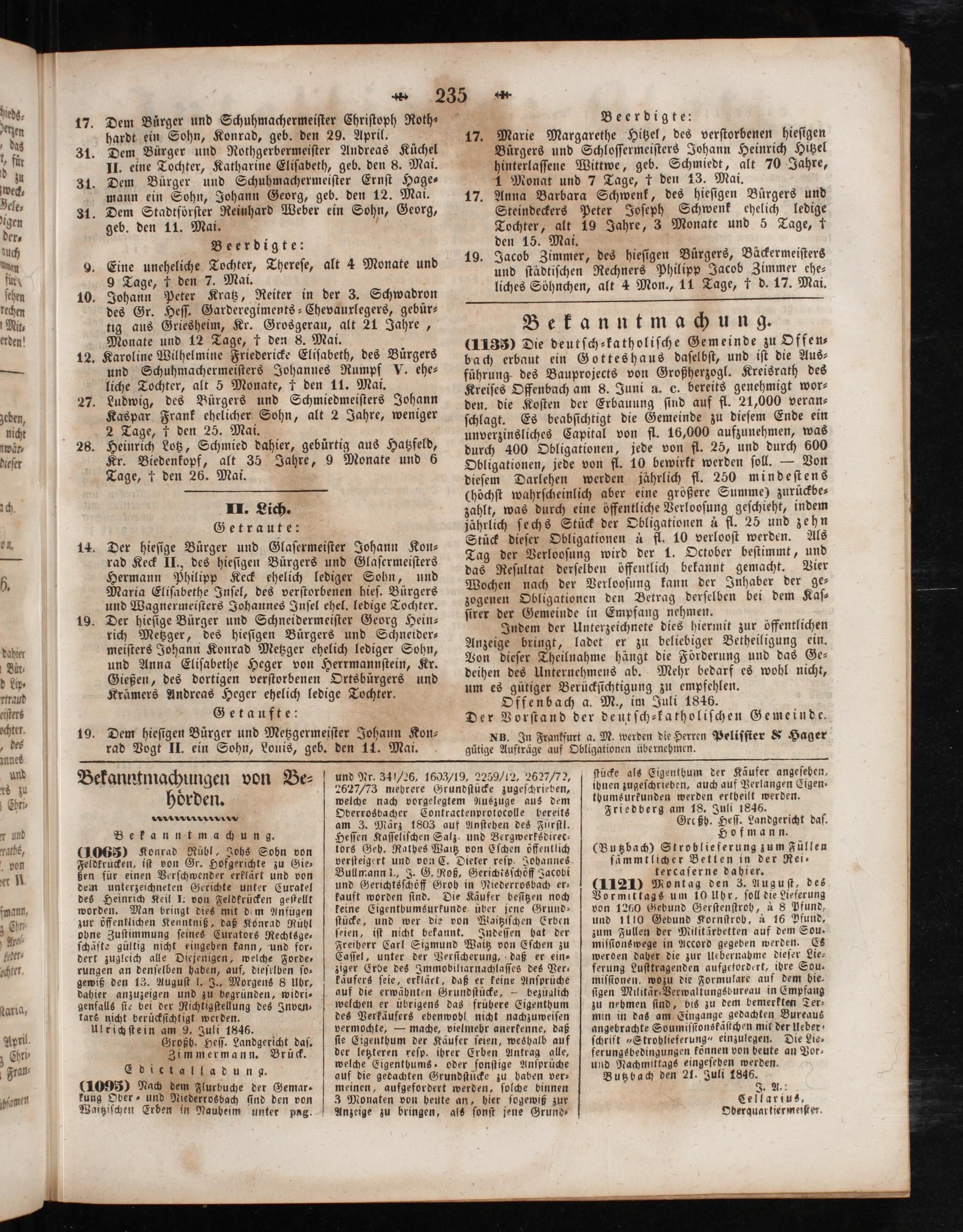 thumsurkunden werden ertheilt werden. Friedberg am 18. Juli 1846. Großh. Heſſ. Landgericht daſ. Hofmann. (Butzbach) Stroblieferung zum Füllen ſämmtlicher Betten in der Rei⸗ tercaſerne dahier. (11210 Montag den 3. Auguſt, des Vormittags um 10 Uhr, ſoll die Lieferung von 1260 Gebund Gerſtenſtroh, a8 Pfund, und 1110 Gebund Kornſtrobh, à 16 Pfund, zum Füllen der Militärbetten auf dem Sou. miſſionswege in Accord gegeben werden. Es werden daher die zur Uebernahme dieſer Lie⸗ ferung Luſttragenden aufgefordert, ihre Sou— miſſionen, wozu die Formulare auf dem bie⸗ ſigen Militär-Verwaltungsbureau in Empfang zu nehmen ſind, bis zu dem bemerkten Ter⸗ min in das am Eingange gedachten Bureaus angebrachte Soumiſſtonskäſtchen mit der Ueber ſchrift„Strohlieferung“ einzulegen. Die Lie⸗ ferungsbedingungen können von beute an Vor⸗ und Nachmittags eingeſehen werden. Butz bach den 21. Juli 1846. . Cellarius, Oberquartiermeiſter.