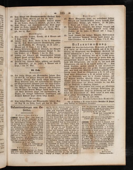 (1065) Konrad Rübl, Johs Sobn von Feldkrucken, iſt von Gr. Hofgerichte zu Gie⸗ ßen für einen Verſchwender erklärt und von dem unterzeichneten Gerichte unter Curatel des Heinrich Keil I. von Feldkrücken geſtellt worden. Man bringt dies mit dem Anfügen zur öffentlichen Kenntniß, daß Konrad Rühl ohne Zuſtimmung ſeines Curators Rechtsge⸗ ſchäfte gültig nicht eingehen kann, und for⸗ dert zugleich alle Diejenigen, welche Forde, rungen an denſelben haben, auf, dieſelben ſo— gewiß den 13. Auguſt J. J., Morgens 8 Uhr, dahier anzuzeigen und zu begründen, widri⸗ genfalls ſie bei der Richtigſtellung des Inven⸗ tars nicht berückſichtigt werden. Ulrichſtein am 9, Juli 1846. Großh. Heſſ. Landgericht daſ. Zimmermann. Brück.