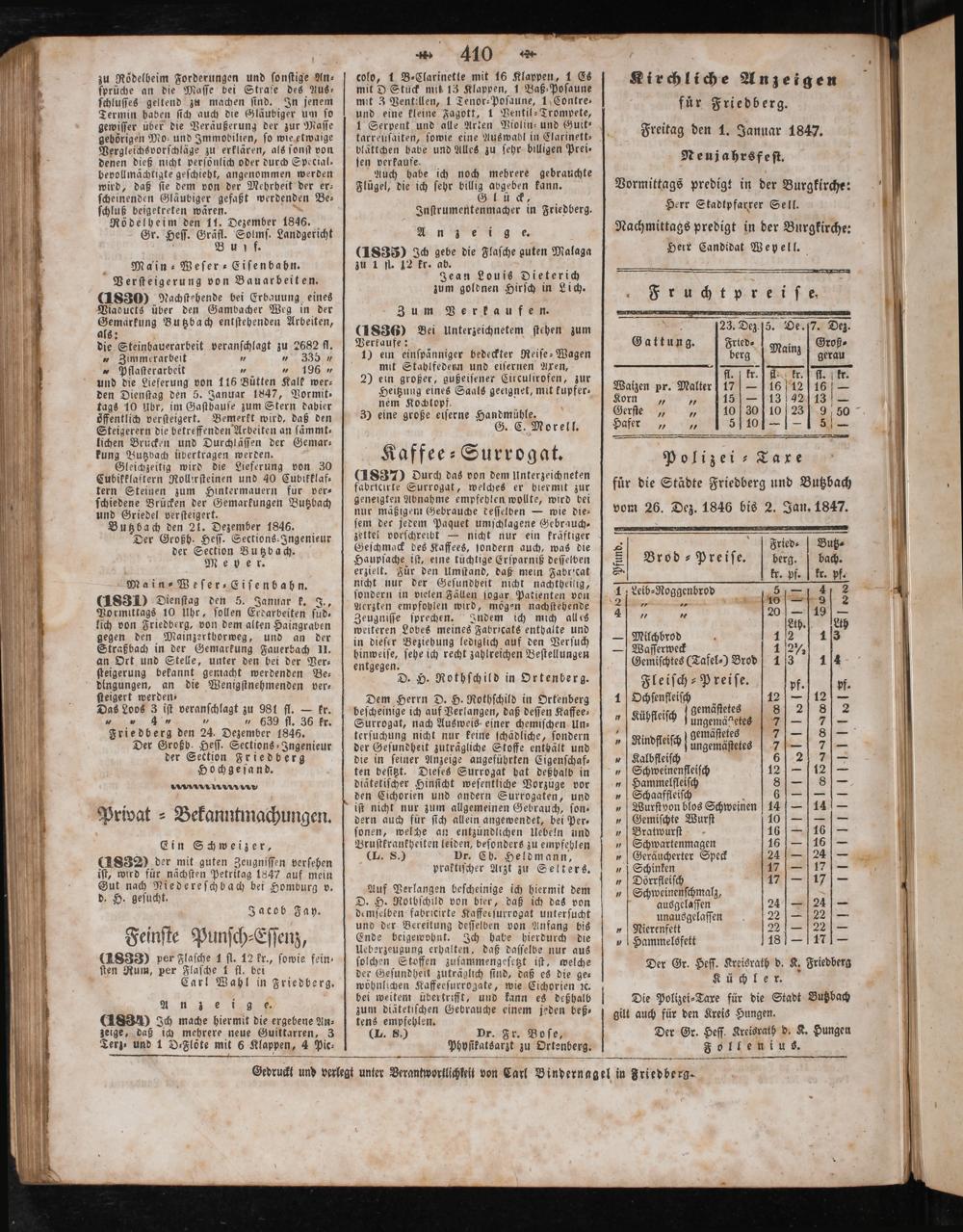 fuͤr die Städte Friedberg und Butzbach vom 26. Dez. 1846 bis 2. Jan. 1847.
