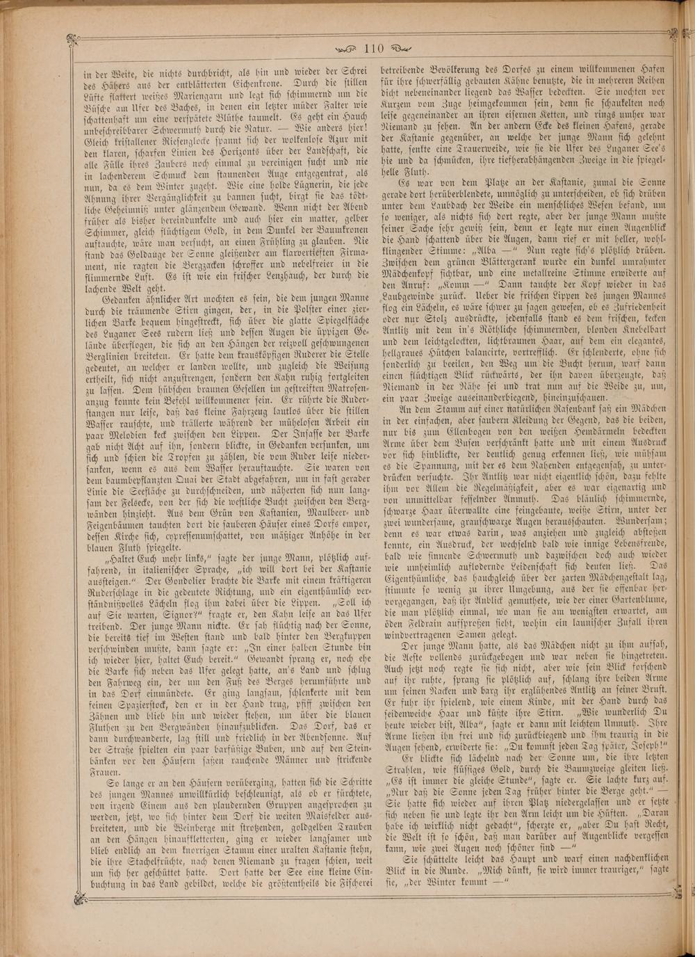 betreibende Bevölkerung des Dorfes zu einem willkommenen Hafen für ihre schwerfällig gebauten Kähne benutzte, die in mehreren Reihen dicht nebeneinander liegend das Wasser bedeckten. Sie mochten vor Kurzem vom Zuge heimgekommen sein, denn sie schaukelten noch leise gegeneinander an ihren eisernen Ketten, und rings umher war Niemand zu sehen. An der andern Ecke des kleinen Hafens, gerade der Kastanie gegenüber, an welche der junge Mann sich gelehnt hatte, senkte eine Trauerweide, wie sie die Ufer des Luganer See's hie und da schmücken, ihre tiefherabhängenden Zweige in die spiegel- helle Fluth. b 835