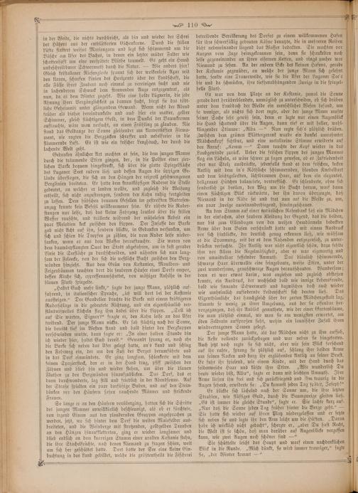 An dem Stamm auf einer natürlichen Rasenbank saß ein Mädchen in der einfachen, aber saubern Kleidung der Gegend, das die beiden, nur bis zum Ellenbogen von den weißen Hemdärmeln bedeckten Arme über dem Busen verschränkt hatte und mit einem Ausdruck vor sich hinblickte, der deutlich genug erkennen ließ, wie mühsam es die Spannung, mit der es dem Nahenden entgegensah, zu unter- drücken versuchte. Ihr Antlitz war nicht eigentlich schön, dazu fehlte ihm vor Allem die Regelmäßigkeit, aber es war eigenartig und von unmittelbar fesselnder Anmuth. Das bläulich schimmernde, schwarze Haar überwallte eine feingebaute, weiße Stirn, unter der zwei wundersame, grauschwarze Augen herausschauten. Wundersam; denn es war etwas darin, was anziehen und zugleich abstoßen konnte, ein Ausdruck, der wechselnd bald wie innige Lebensfreude, bald wie sinnende Schwermuth und dazwischen doch auch wieder wie umheimlich auflodernde Leidenschaft sich deuten ließ. Das Eigenthümliche, das hauchgleich über der zarten Mädchengestalt lag, stimmte so wenig zu ihrer Umgebung, aus der sie offenbar her⸗