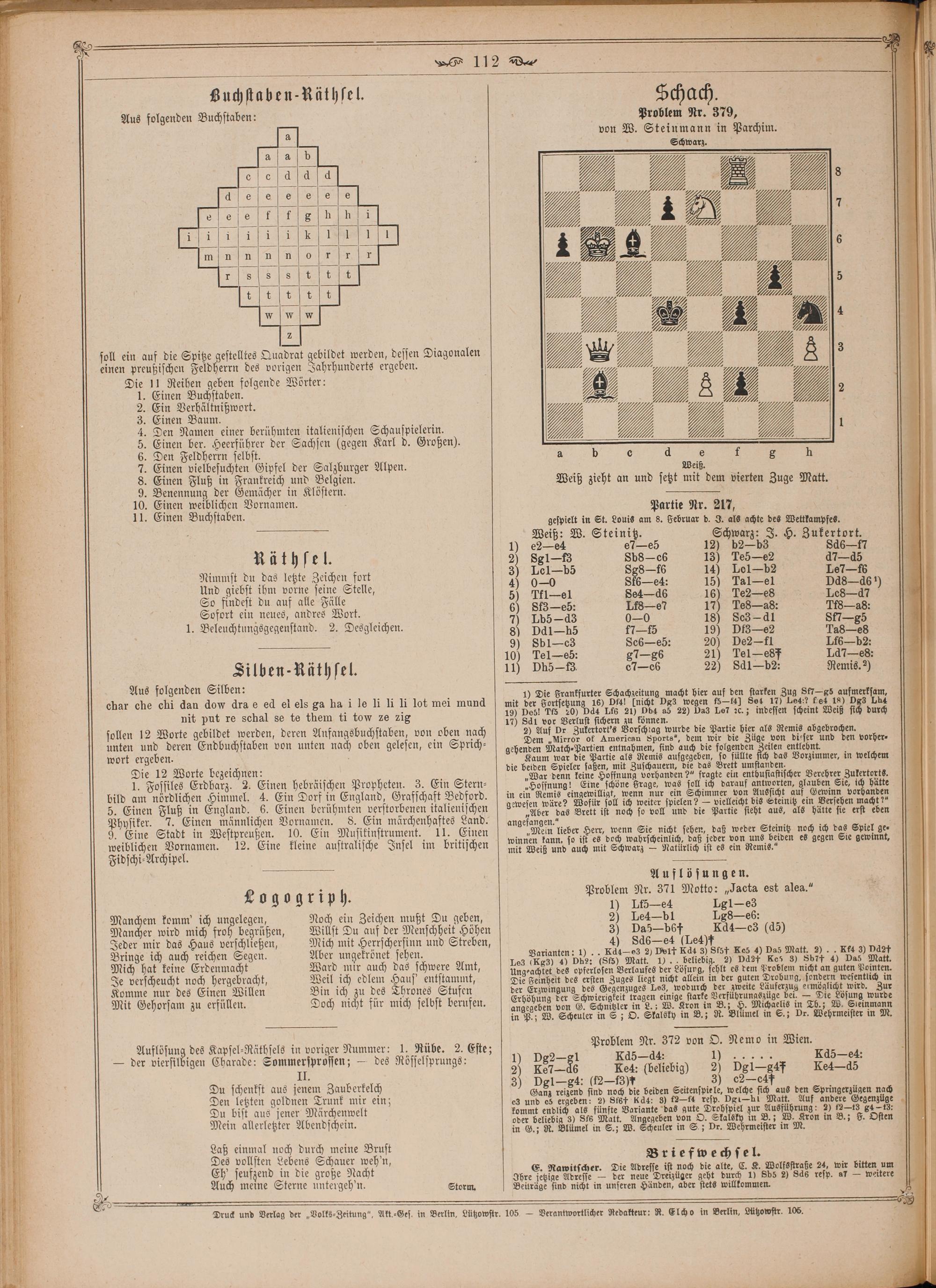 Schach. 0 Problem Nr. 379, 5 von W. Steinmann in Parchim.
