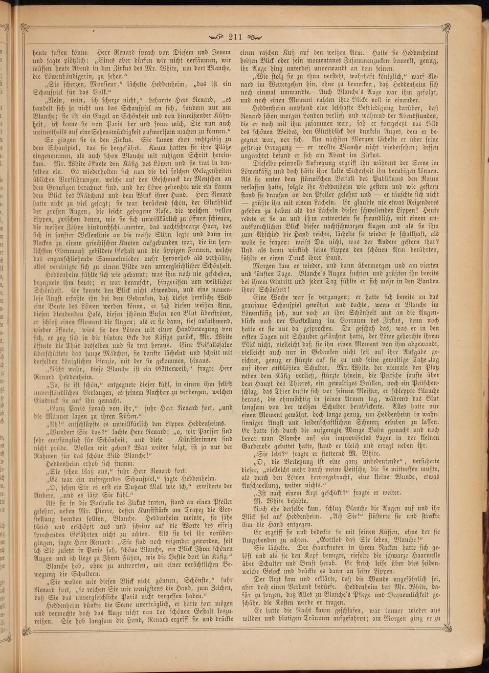 Heddenheim empfand eine lebhafte Befriedigung darüber, daß Renard schon morgen London verließ und während der Abendstunden, die er noch mit ihm zusammen war, sah er fortgesetzt das Bild des schönen Weibes, den Gluthblick des dunkeln Auges, dem er be— gegnet war, vor sich. Am nächsten Morgen lächelte er über seine gestrige Erregung— er wollte Blanche nicht wiedersehen; dessen ungeachtet befand er sich am Abend im Zirkus.