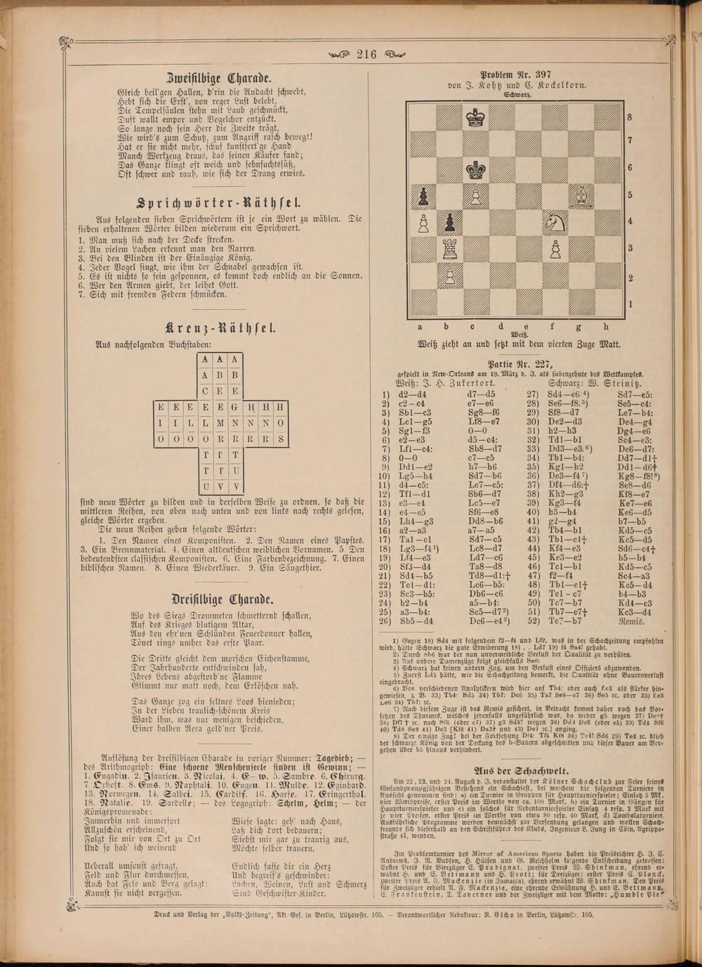 Partie Nr. 227, gespielt in New-Orleans am 19. März d. J. als siebenzehnte des Wettkampfes. Weiß: J. H. Zukertort. Schwarz: W. Steinitz.