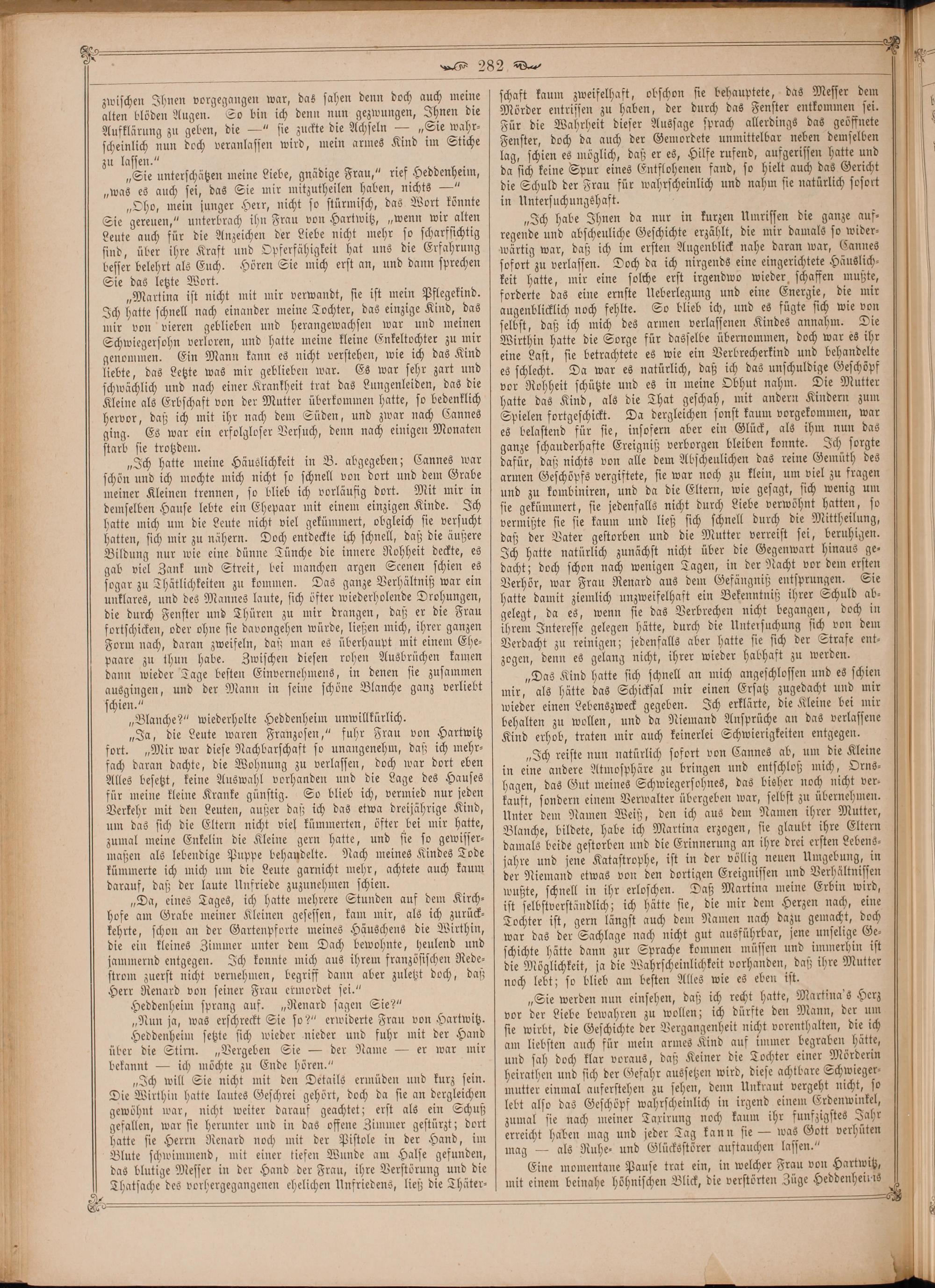 „Ich will Sie nicht mit den Details ermüden und kurz sein. Die Wirthin hatte lautes Geschrei gehört, doch da sie an dergleichen gewöhnt war, nicht weiter darauf geachtet; erst als ein Schuß gefallen, war sie herunter und in das offene Zimmer gestürzt; dort hatte sie Herrn Renard noch mit der Pistole in der Hand, im Blute schwimmend, mit einer tiefen Wunde am Halse gefunden, das blutige Messer in der Hand der Frau, ihre Verstörung und die Thatsache des vorhergegangenen ehelichen Unfriedens, ließ die Thäter—