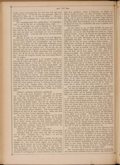 „Sie werden nun einsehen, daß ich recht hatte, Martina's Herz vor der Liebe bewahren zu wollen; ich dürfte den Mann, der um sie wirbt, die Geschichte der Vergangenheit nicht vorenthalten, die ich am liebsten auch für mein armes Kind auf immer begraben hätte, und sah doch klar voraus, daß Keiner die Tochter einer Mörderin heirathen und sich der Gefahr aussetzen wird, diese achtbare Schwieger⸗ mutter einmal auferstehen zu sehen, denn Unkraut vergeht nicht, so lebt also das Geschöpf wahrscheinlich in irgend einem Erdenwinkel, zumal sie nach meiner Taxirung noch kaum ihr funfzigstes Jahr erreicht haben mag und jeder Tag kann sie— was Gott verhüten mag— als Ruhe- und Glücksstörer auftauchen lassen.“ i