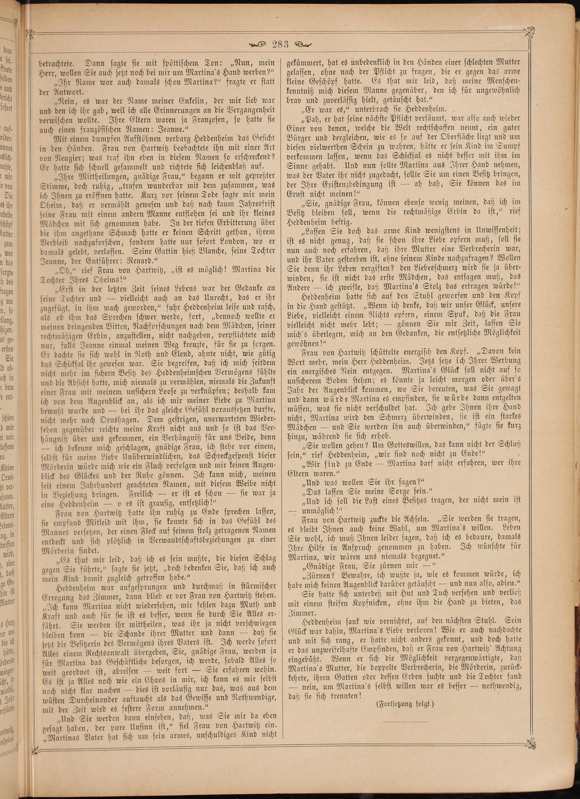 „Ihre Mittheilungen, gnädige Frau,“ begann er mit gepreßter Stimme, doch ruhig,„trafen wunderbar mit dem zusammen, was ich Ihnen zu eröffnen hatte. Kurz vor seinem Tode sagte mir mein Oheim, daß er vermählt gewesen und daß nach kaum Jahresfrist seine Frau mit einem andern Manne entflohen sei und ihr kleines Mädchen mit sich genommen habe. In der tiefen Erbitterung über die ihm angethane Schmach hatte er keinen Schritt gethan, ihrem Verbleib nachzuforschen, sondern hatte nur sofort London, wo er damals gelebt, verlassen. Seine Gattin hieß Blanche, seine Tochter Jeanne, der Entführer: Renard.“