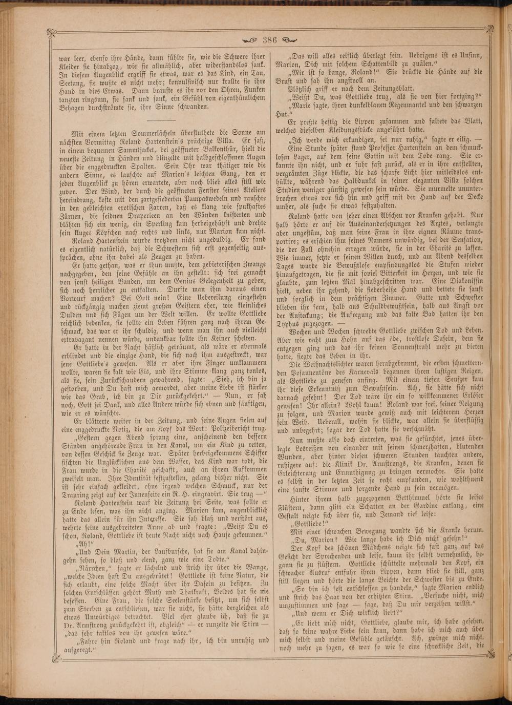Mit einem letzten Sommerlächeln überfluthete die Sonne am nächsten Vormittag Roland Hartenstein's prächtige Villa. Er saß, in einem bequemen Sammtjacket, bei geöffneter Balkonthür, hielt die neueste Zeitung in Händen und blinzelte mit halbgeschlossenen Augen über die enggedruckten Spalten. Sein Ohr war thätiger wie die andern Sinne, es lauschte auf Marion's leichten Gang, den er jeden Augenblick zu hören erwartete, aber noch blieb alles still wie zuvor. Der Wind, der durch die geöffneten Fenster seines Ateliers hereindrang, koste mit den zartgefiederten Pampaswedeln und rauschte in den gebleichten exotischen Farren, daß es klang wie spukhaftes Zürnen, die seidnen Draperieen an den Wänden knisterten und blähten sich ein wenig, ein Sperling kam herbeigehüpft und drehte sein kluges Köpfchen nach rechts und links, nur Marion kam nicht.