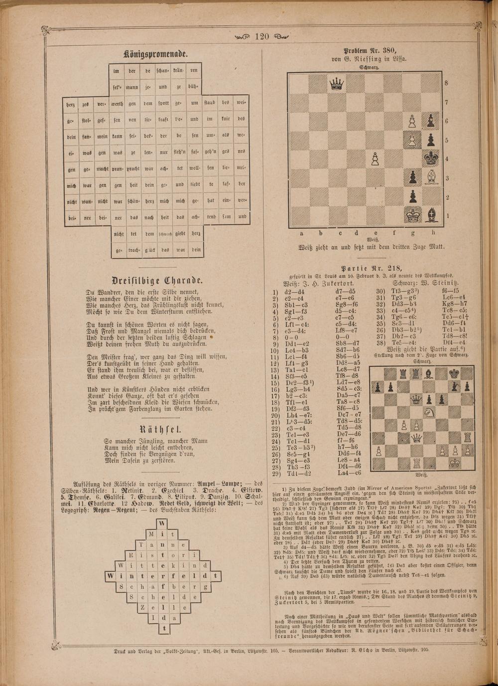 Steinitz gewonnen, die 17. ergab Remis. Der Stand des Matches ist demnach Steinitz 9,