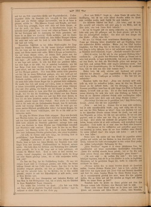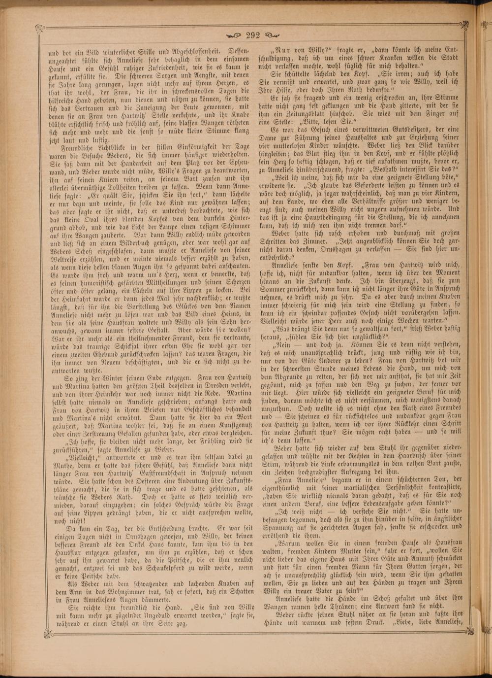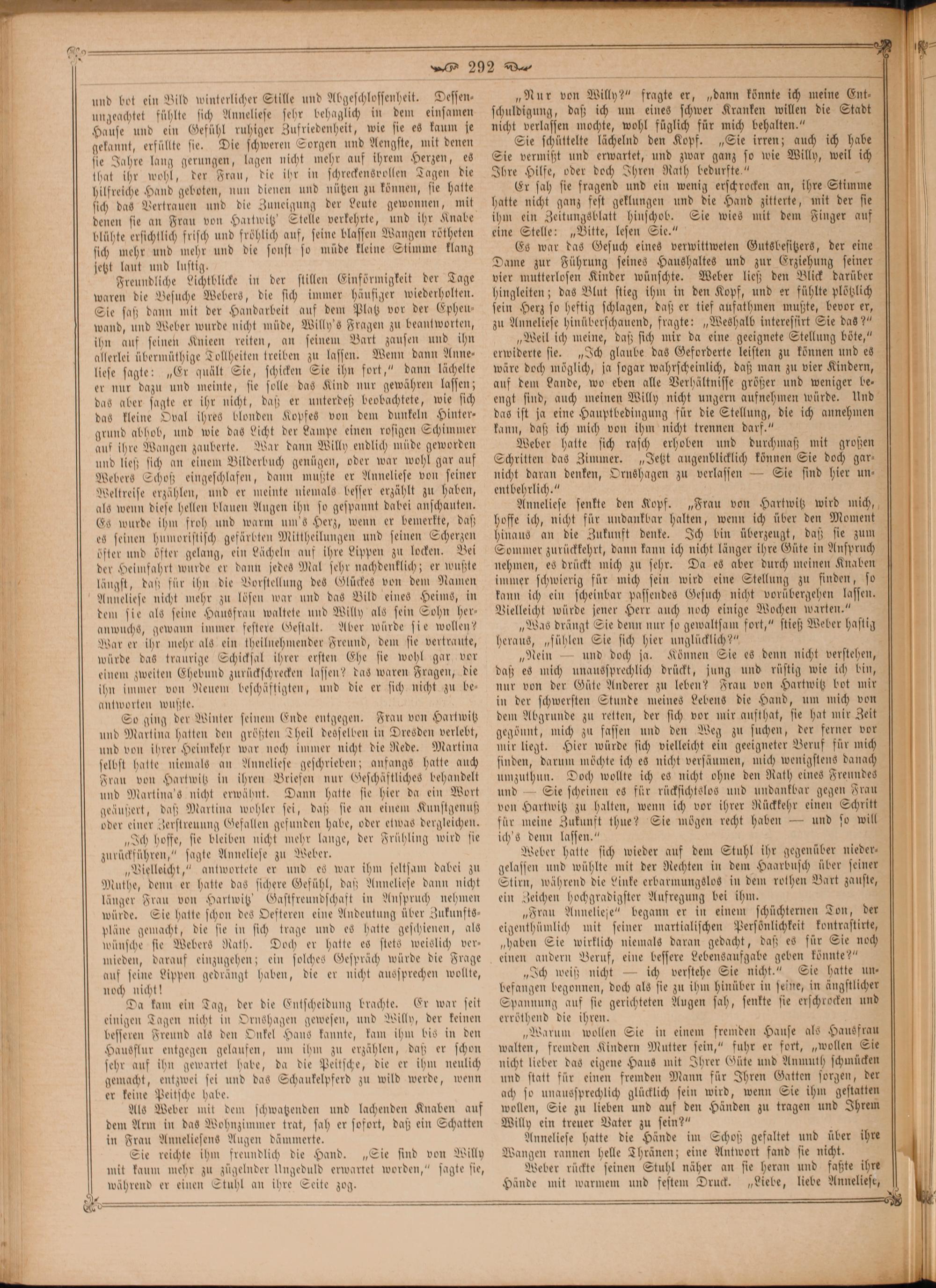 Es war das Gesuch eines verwittweten Gutsbesitzers, der eine Dame zur Führung seines Haushaltes und zur Erziehung seiner vier mutterlosen Kinder wünschte. Weber ließ den Blick darüber hingleiten; das Blut stieg ihm in den Kopf, und er fühlte plötzlich[ sein Herz so heftig schlagen, daß er tief aufathmen mußte, bevor er, zu Anneliese hinüberschauend, fragte:„Weshalb interessirt Sie das?“