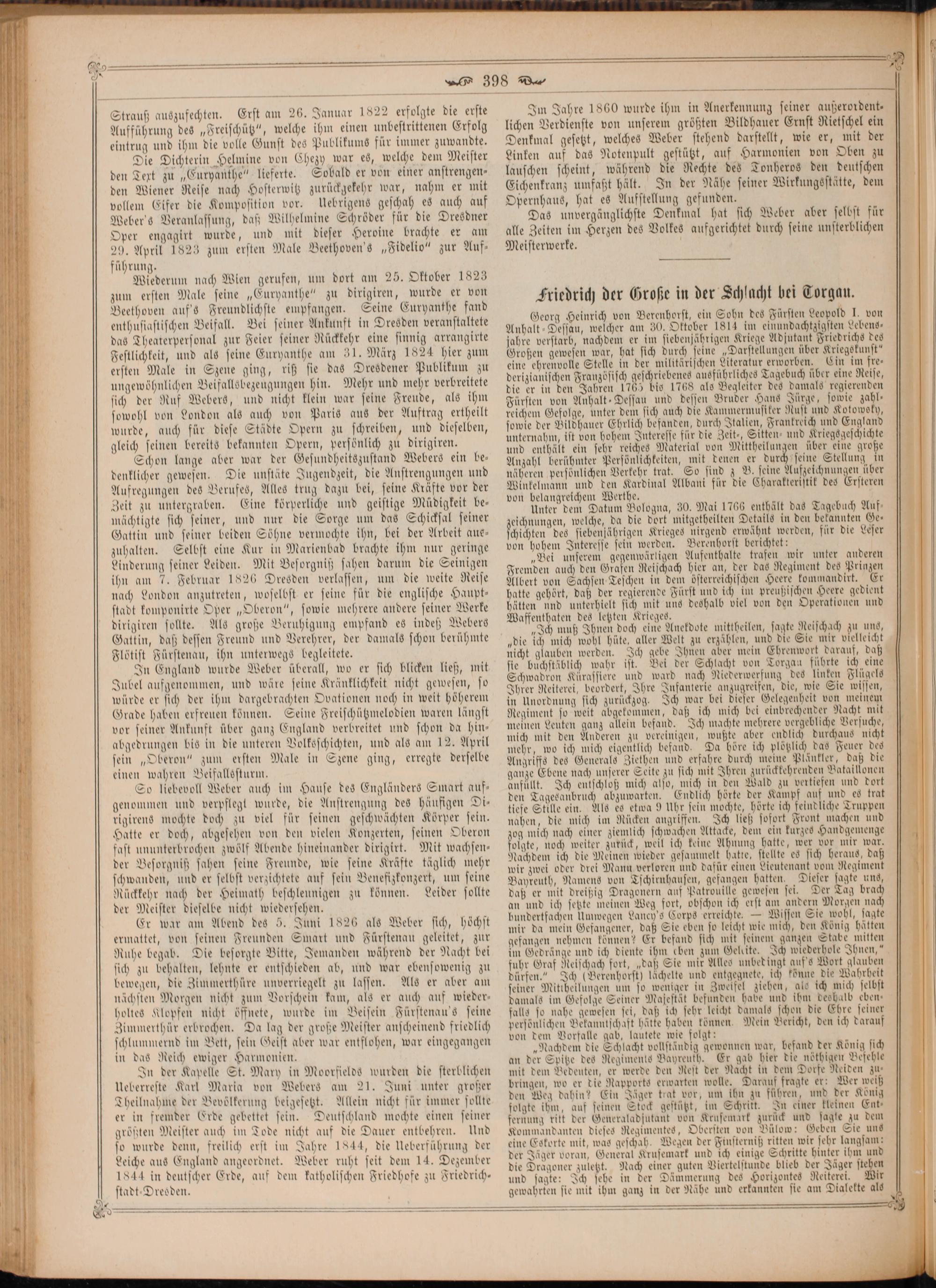 Im Jahre 1860 wurde ihm in Anerkennung seiner außerordent⸗ lichen Verdienste von unserem größten Bildhauer Ernst Rietschel ein Denkmal gesetzt, welches Weber stehend darstellt, wie er, mit der Linken auf das Notenpult gestützt, auf Harmonien von Oben zu lauschen scheint, während die Rechte des Tonheros den deutschen Eichenkranz umfaßt hält. In der Nähe seiner Wirkungsstätte, dem Opernhaus, hat es Aufstellung gefunden.