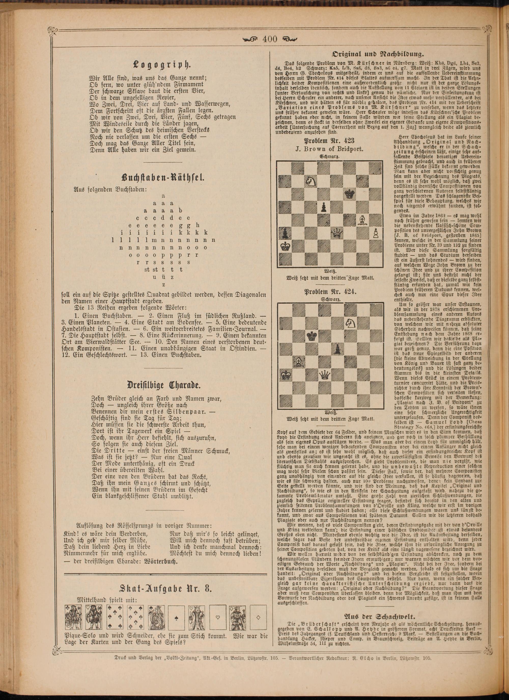 Das folgende Problem von M. Kürschner in Nülrnberg: Weiß: Kbs. Dgé, Lha, Ses. da, Bed, h2 Schwarz: Ka5, Lis, Sas, ds, Bag, aß ot, g7. Matt in drei Zügen, wird uns von Herrn G. Chocholous mitgelbeilt, indem er uns auf die auffallende Uebereinstimmung desselben mit Problem Nr. 414 dieses Blattes aufmerksam macht. In der That ist die Aehn⸗