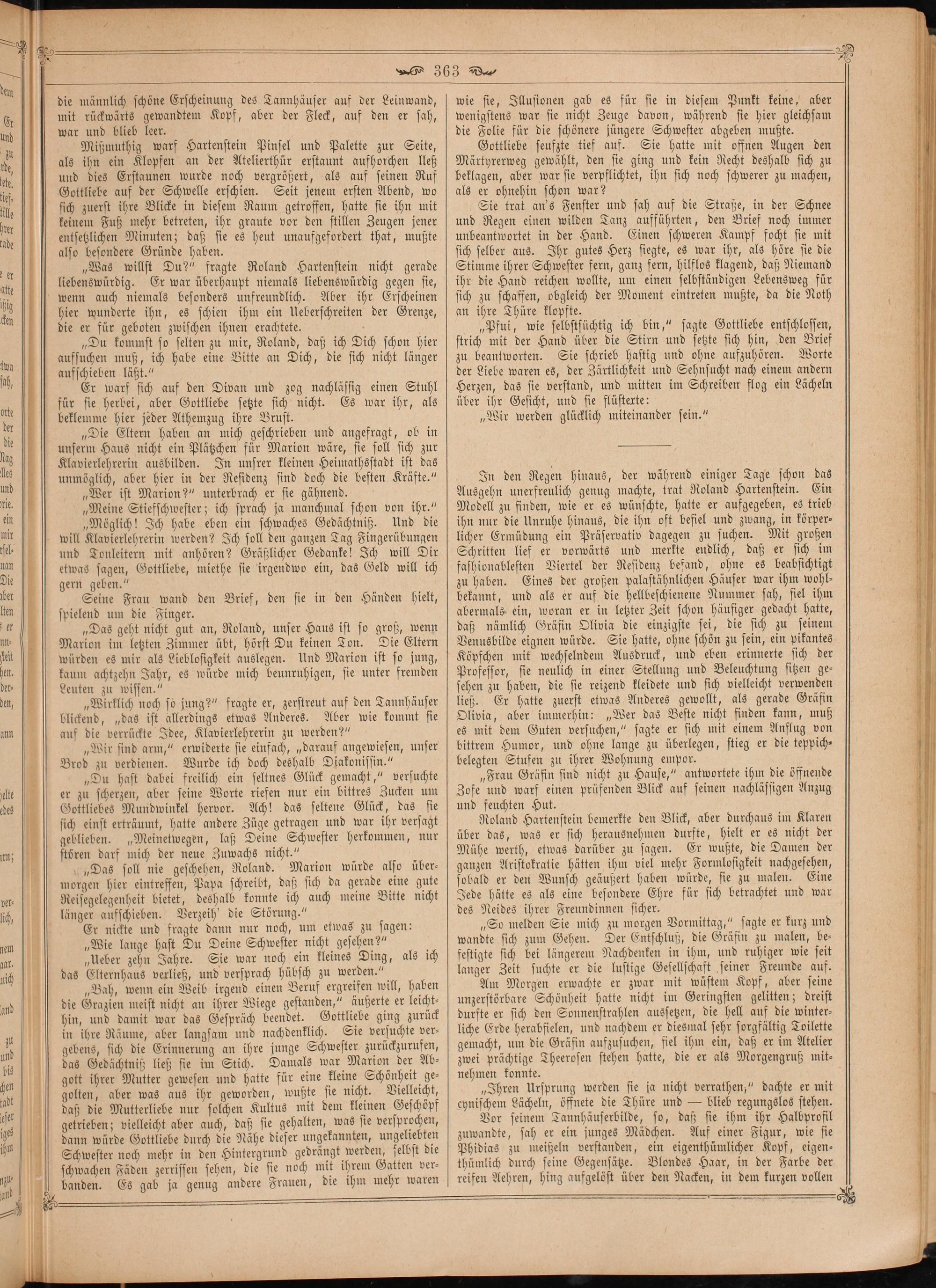 „Bah, wenn ein Weib irgend einen Beruf ergreifen will, haben die Grazien meist nicht an ihrer Wiege gestanden,“ äußerte er leicht hin, und damit war das Gespräch beendet. Gottliebe ging zurück in ihre Räume, aber langsam und nachdenklich. Sie versuchte ver— gebens, sich die Erinnerung an ihre junge Schwester zurückzurufen, das Gedächtniß ließ sie im Stich. Damals war Marion der Ab⸗ gott ihrer Mutter gewesen und hatte für eine kleine Schönheit ge⸗ golten, aber was aus ihr geworden, wußte sie nicht. Vielleicht, daß die Mutterliebe nur solchen Kultus mit dem kleinen Geschöpf getrieben; vielleicht aber auch, daß sie gehalten, was sie versprochen, dann würde Gottliebe durch die Nähe dieser ungekannten, ungeliebten Schwester noch mehr in den Hintergrund gedrängt werden, selbst die schwachen Fäden zerrissen sehen, die sie noch mit ihrem Gatten ver⸗ banden. Es gab ja genug andere Frauen, die ihm mehr waren