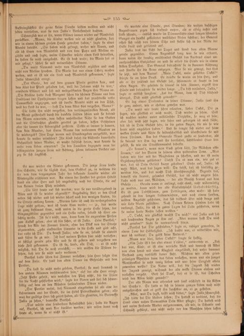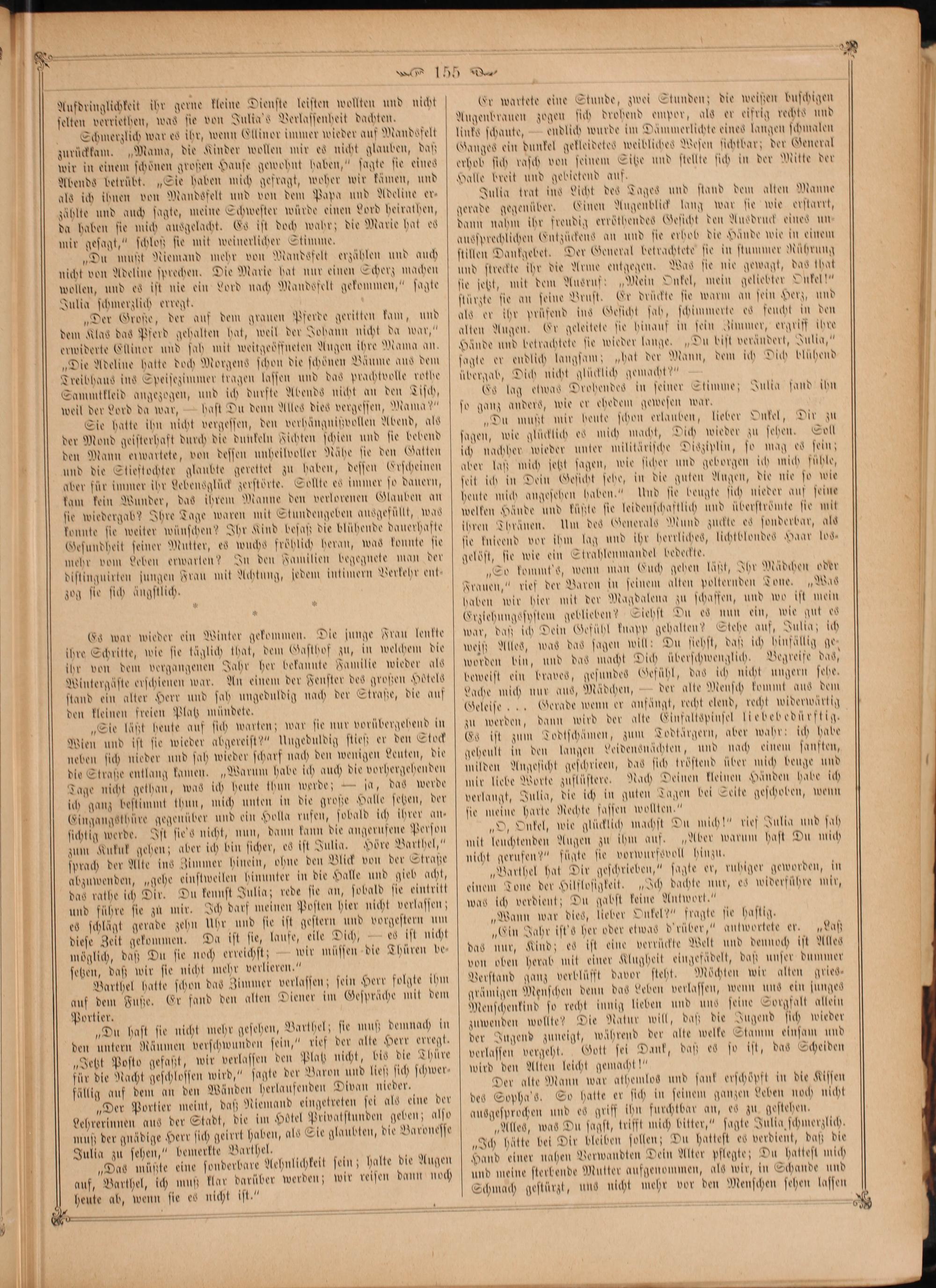 Er wartete eine Stunde, zwei Stunden; die weißen buschigen Augenbrauen zogen sich drohend empor, als er eifrig rechts und links schaute,— endlich wurde im Dämmerlichte eines langen schmalen Ganges ein dunkel gelleidetes weibliches Wesen sichtbar; der General erhob sich rasch von seinem Sitze und stellte sich in der Mitte der Halle breit und gebietend auf.